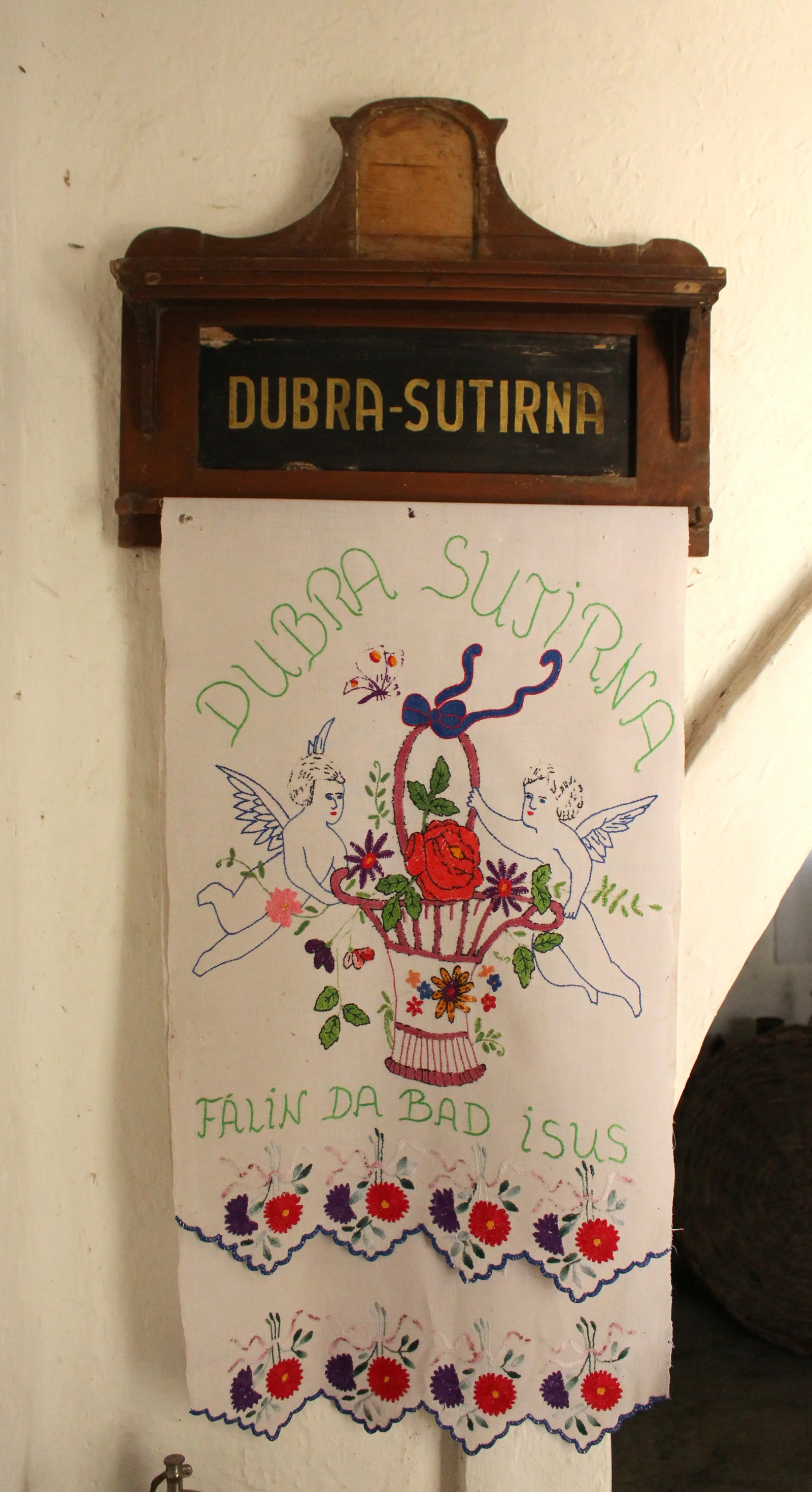 Description: Embroidered with colorful embroidery thread using stem stitch and satin stitch. Motif: putti with a flower basket. Both ends terminate in four scallops, each scallop containing a bouquet of red and dark purple flowers. Inscription: „DUBRA SUTIRNA / FELIN DA BAD ISUS”