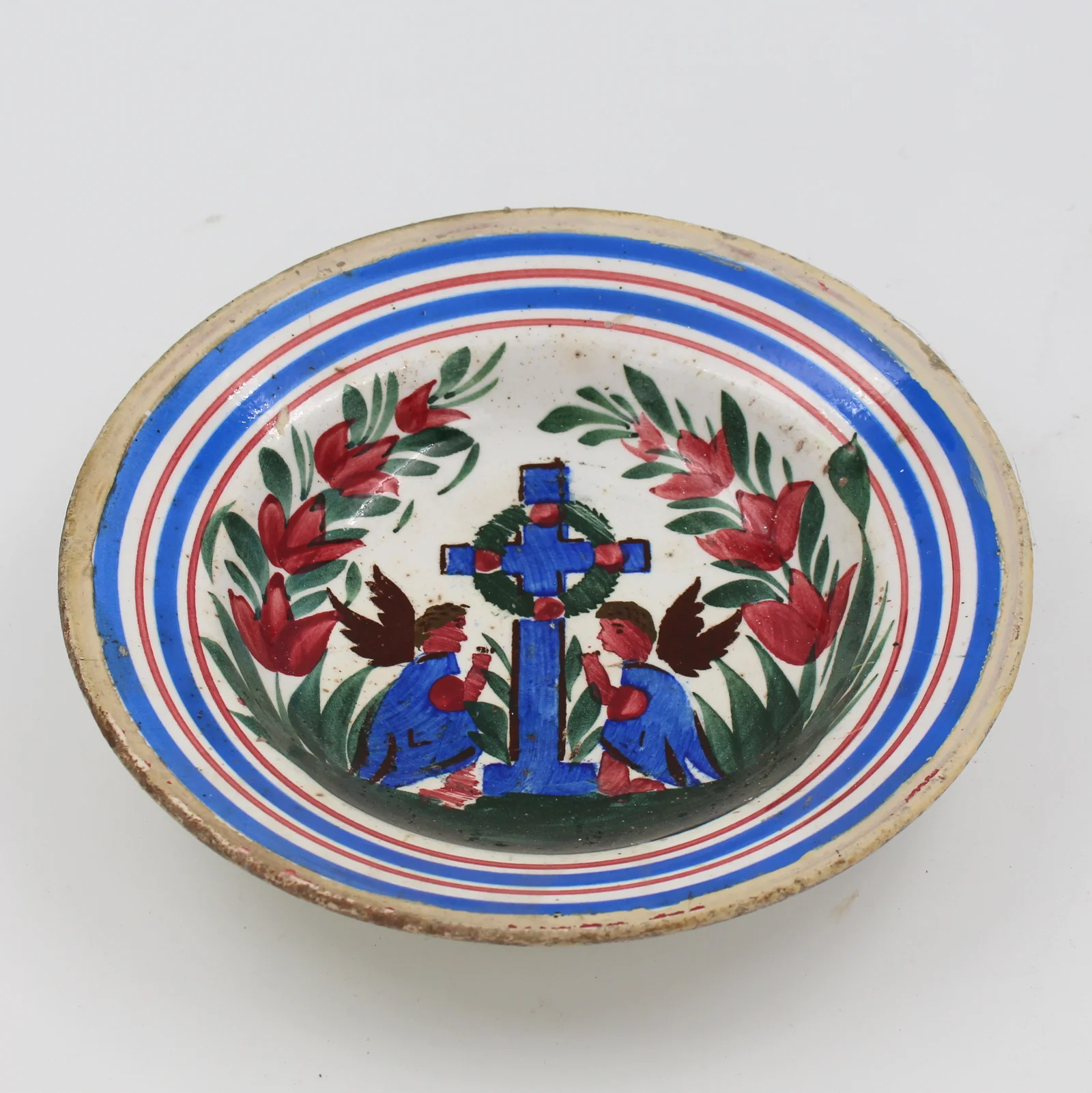 Description: Blue and red stripes on the rim. The interior is hand-painted, with a scene surrounded by a half-wreath of tulips and leaves: angels in blue robes pray on either side of a blue, small-flowered wreath-adorned cross. Base mark: "Hollóháza"