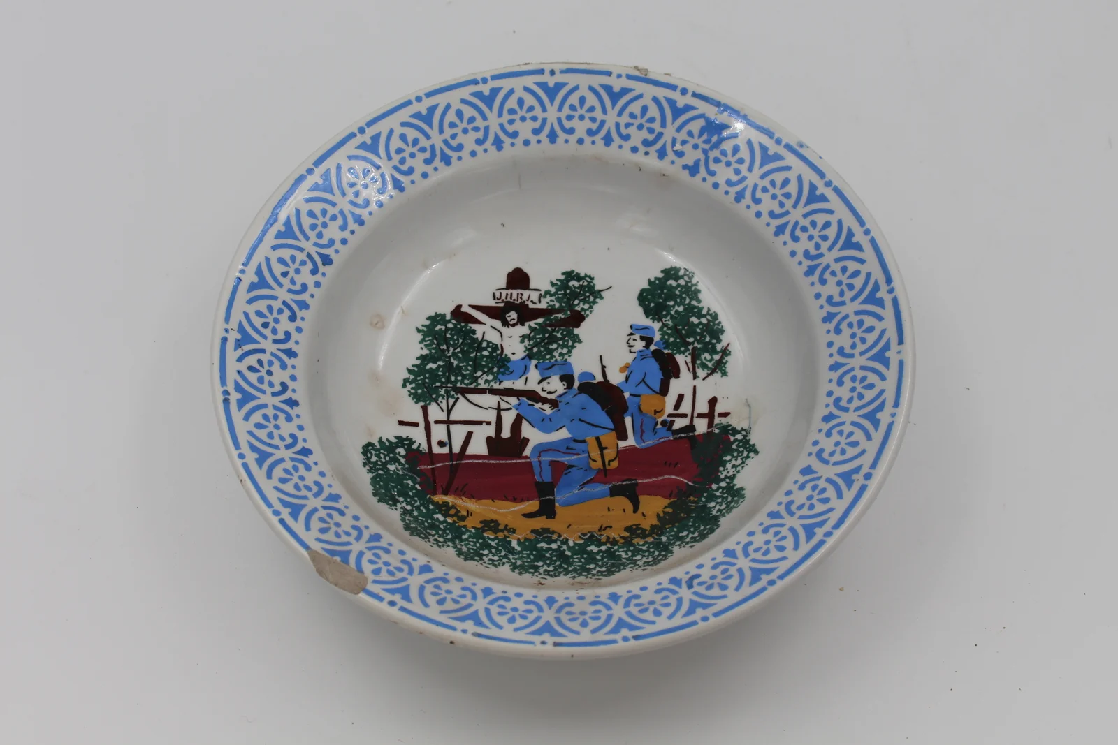 Description: Stencil-decorated rim, hand-painted interior. Motif: battle scene with two soldiers and a roadside cross. No base mark.