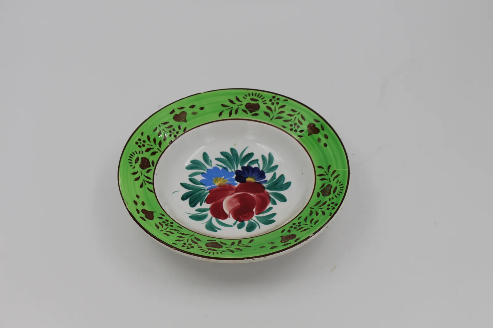 Description: Its rim is a vibrant, light green, with stenciled decoration. A hand-painted floral bouquet is on its base. Based on its base mark (bird on a house roof), it is a product of the Hollóháza manufactory.