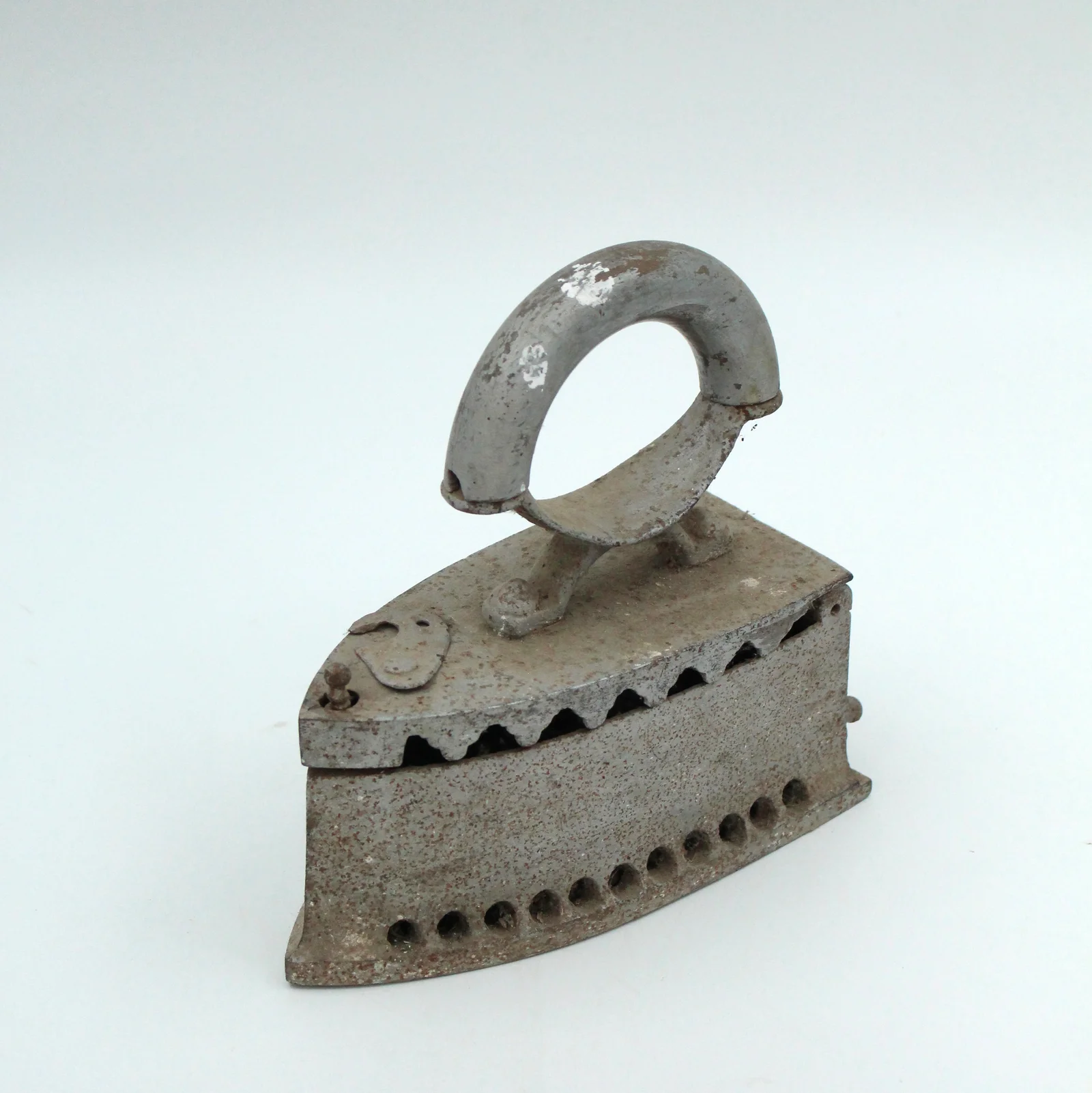 Description: Its lid has fallen apart. It has a curved wooden handle. Its side vents are triangular.