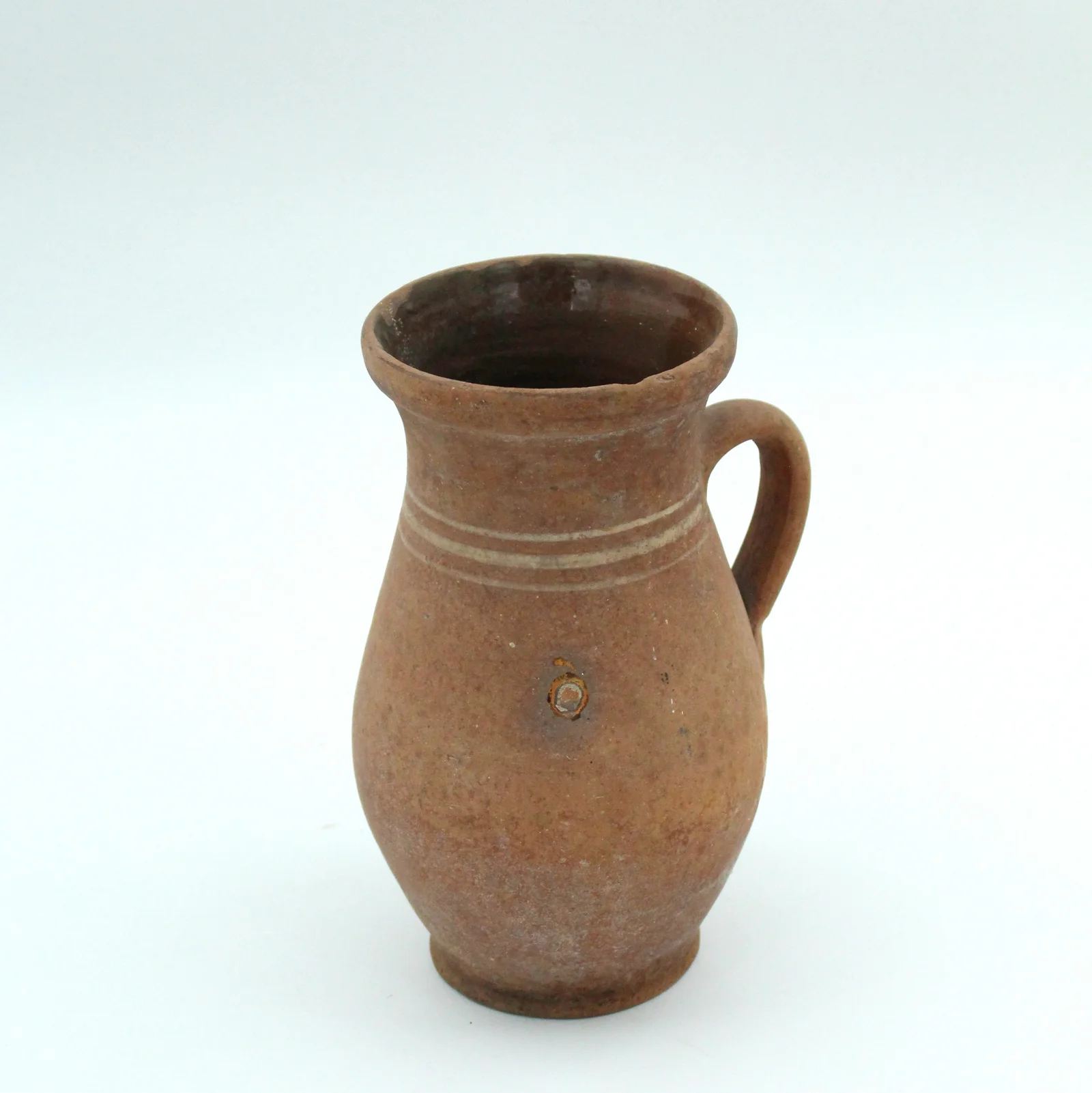 Description: Single-handled. Unglazed on the outside, glazed on the inside (brownish-green). Three stripes on its neck.