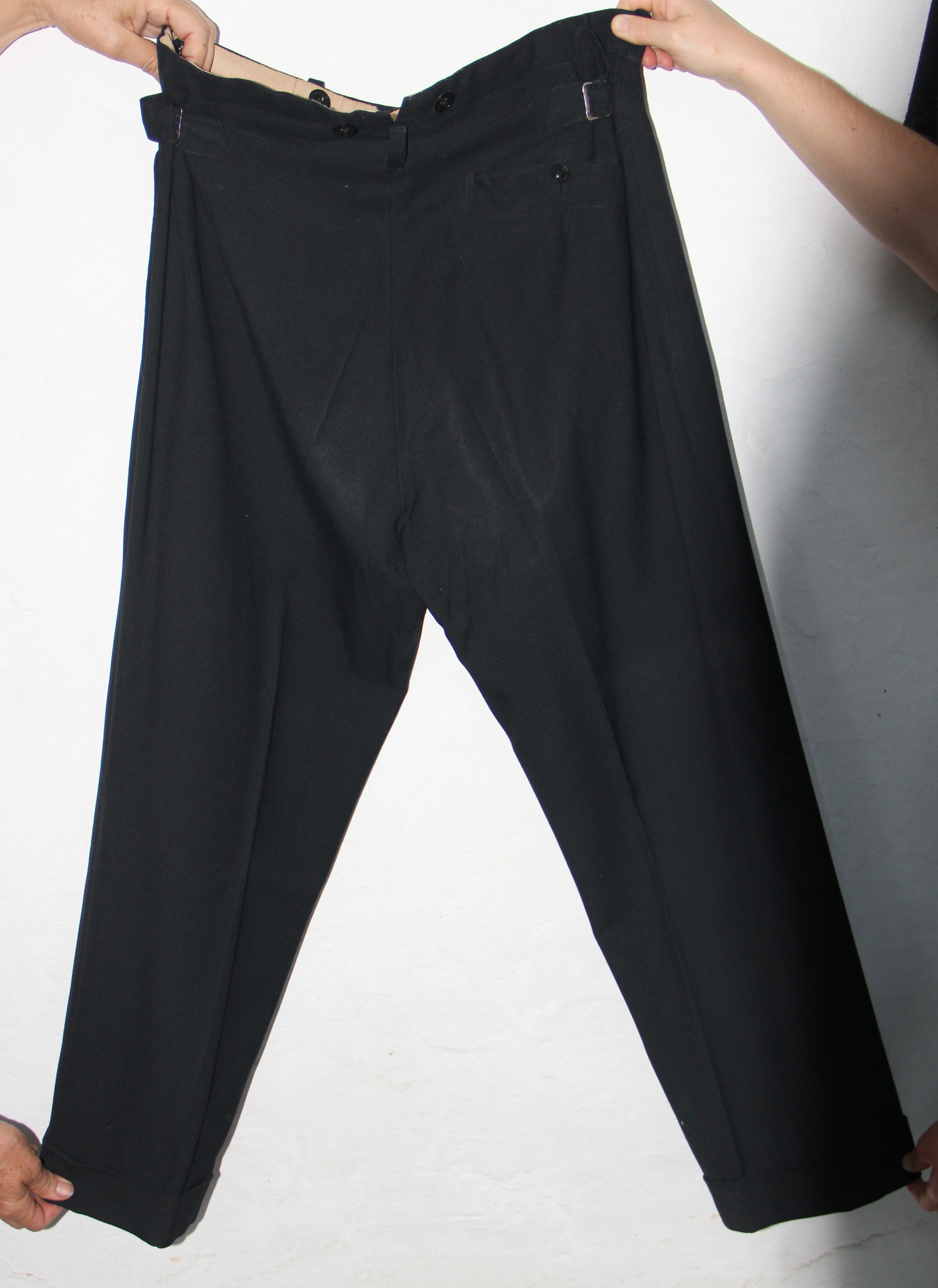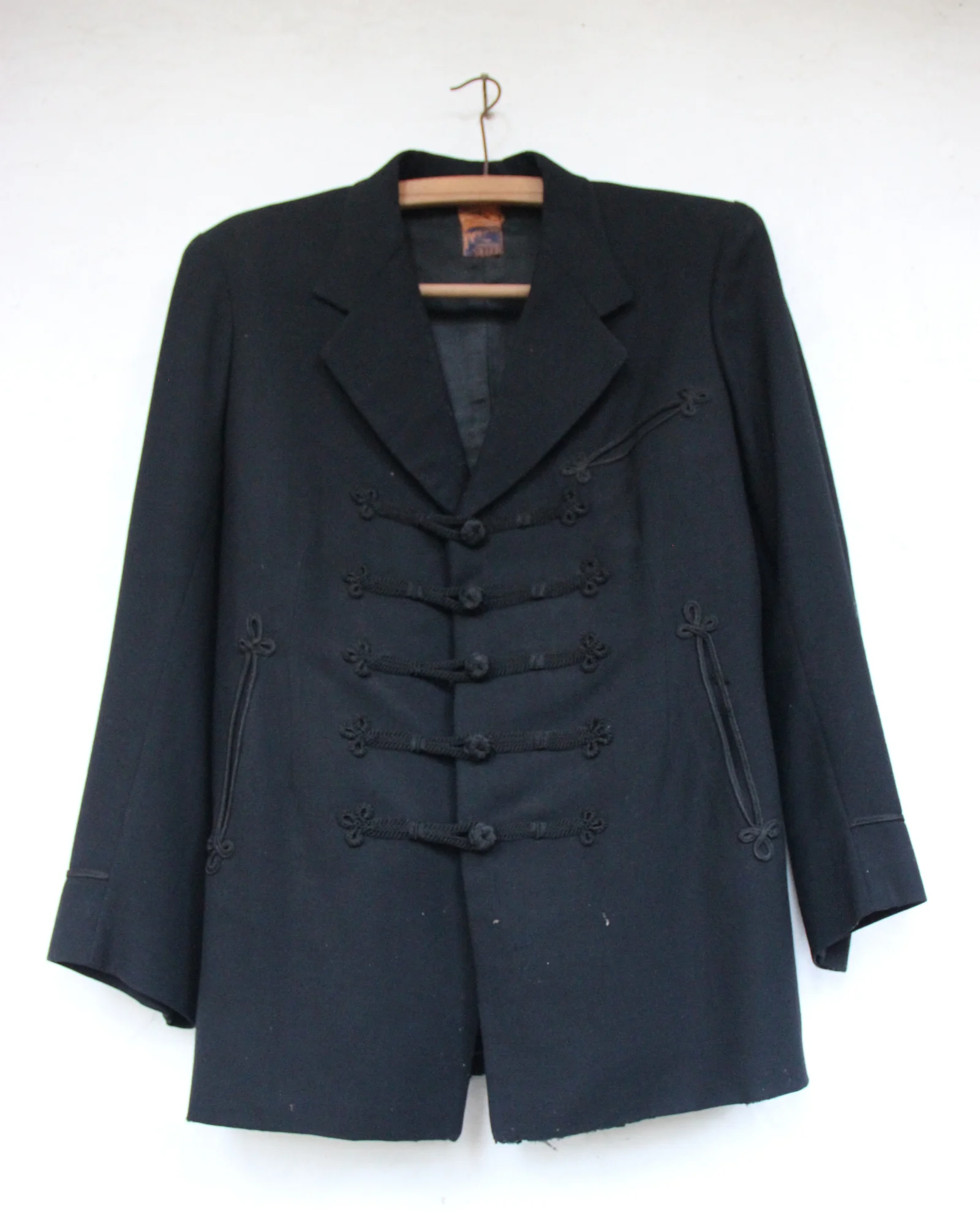 Description: The front of the jacket has 5 pieces of braid. It has a hidden button closure. The pockets and sleeves are also braided. On the back of the jacket, at the bottom, on both sides, there are 3 short braided ornaments. There is a label on the neck: the top is frayed, only this much is legible: "… gentlemen's tailoring Szeged". It has a hanger. It comes with ironed trousers. The trousers have adjusters and two buttons for suspenders.