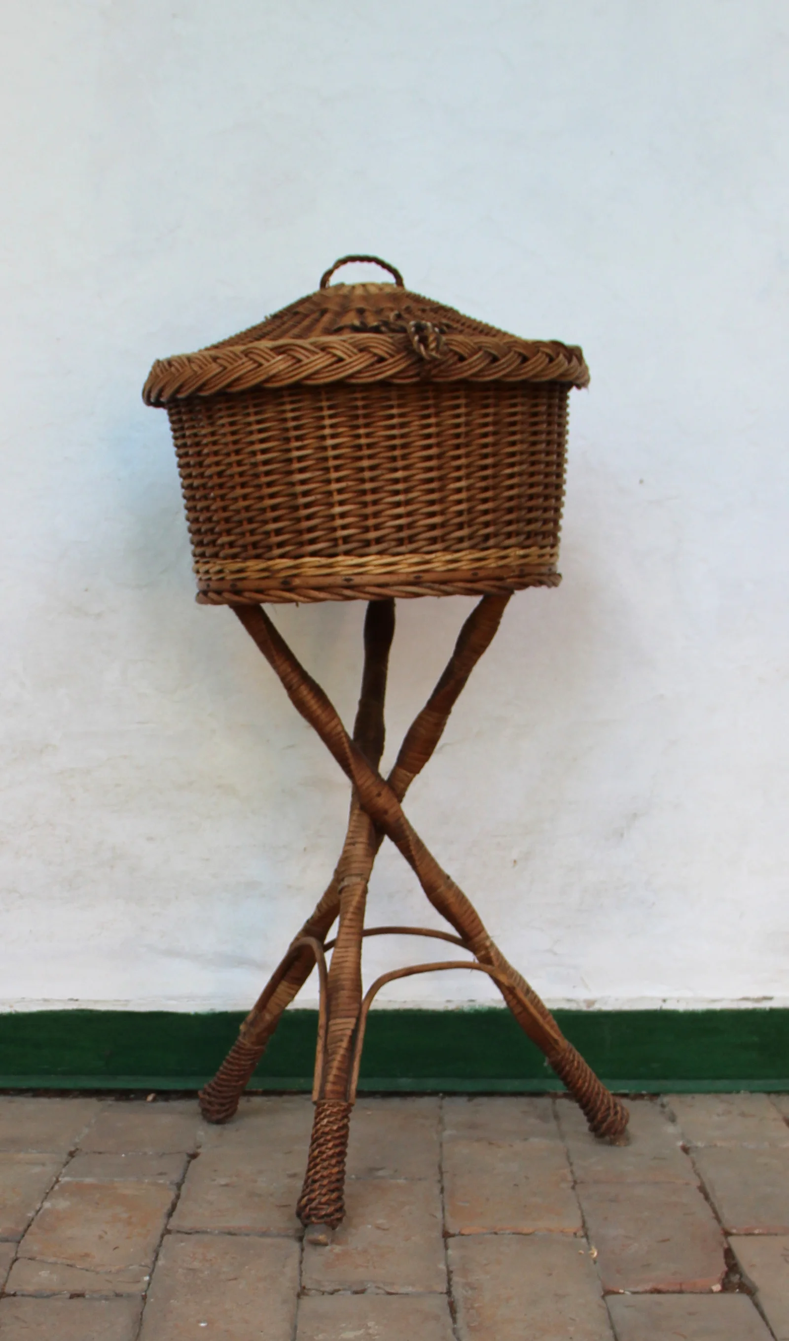 Description: Three-legged. Its legs are woven with split wicker. Made of solid wicker, with a wooden base. The top is made of split wicker, slightly damaged in a small area. The top closes with a wicker twist. Its plinth consists of a triple braid made of three wicker bundles. Likely originates from a workshop in Martonos.