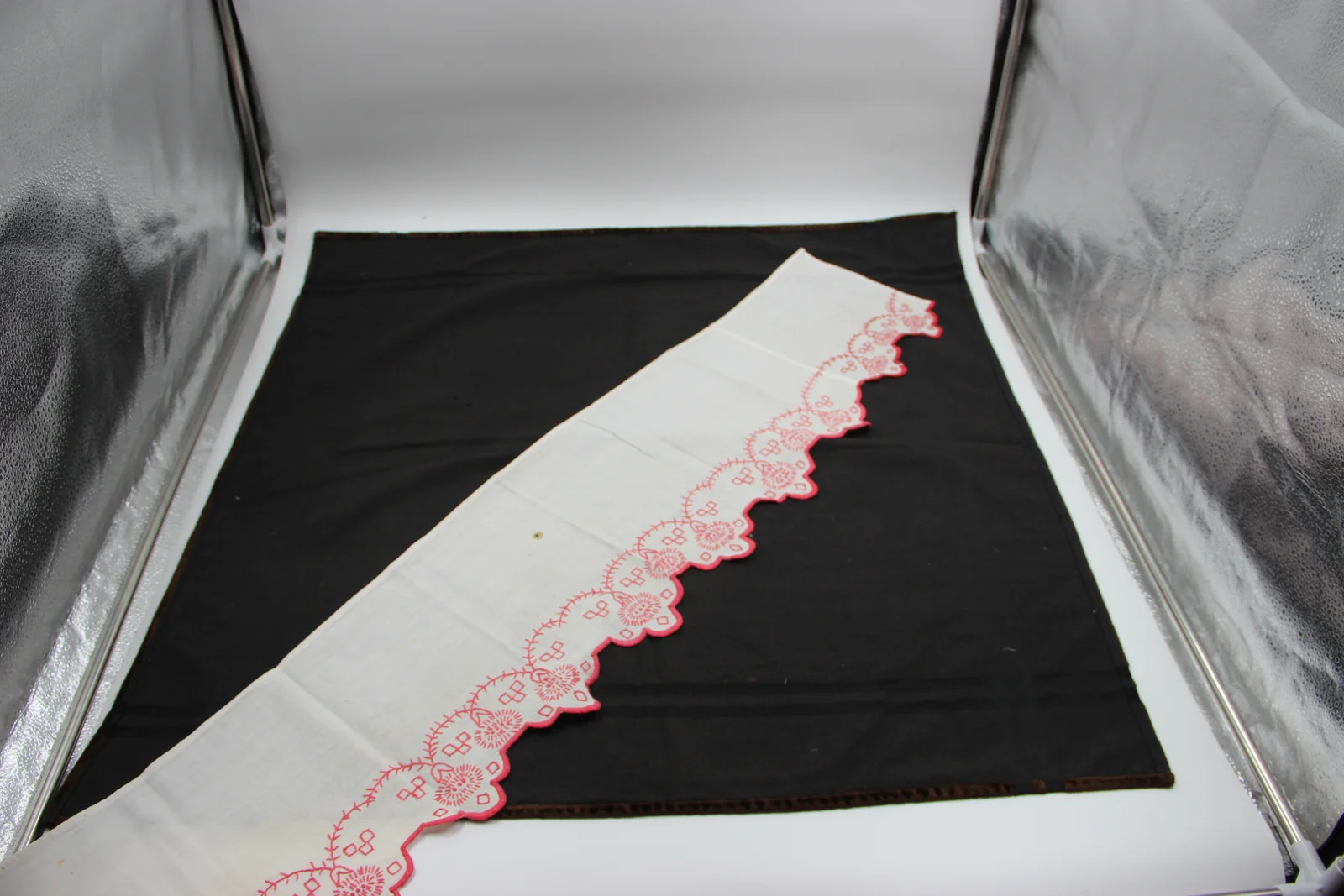 Description: Needlepoint motif embroidered with simple stem stitch. With red embroidery thread.