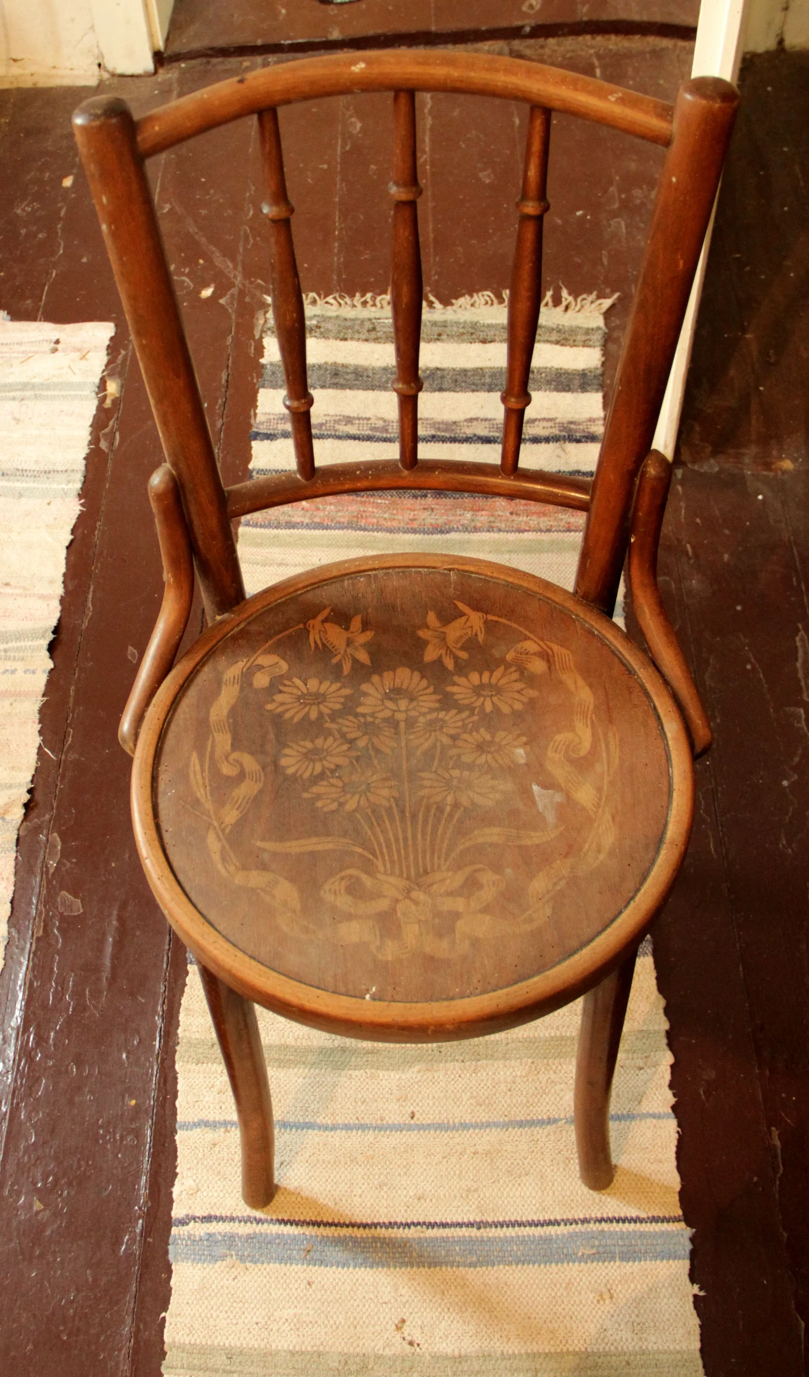 Description: Their backrests are latticed. Their seats are made of steamed wood, decorated with a pattern of a flower bouquet with a bow.