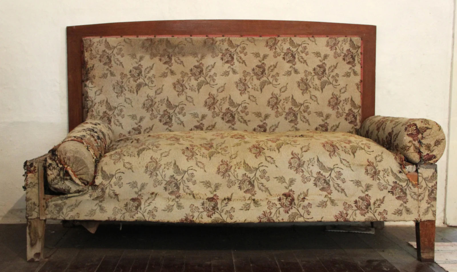 Description: Stands on square legs. Sprung. Its two armrests are cylindrical. Its backrest is framed by a wider wooden frame. The upholstery on the seat is sponge, while the armrests and backrest are filled with straw.