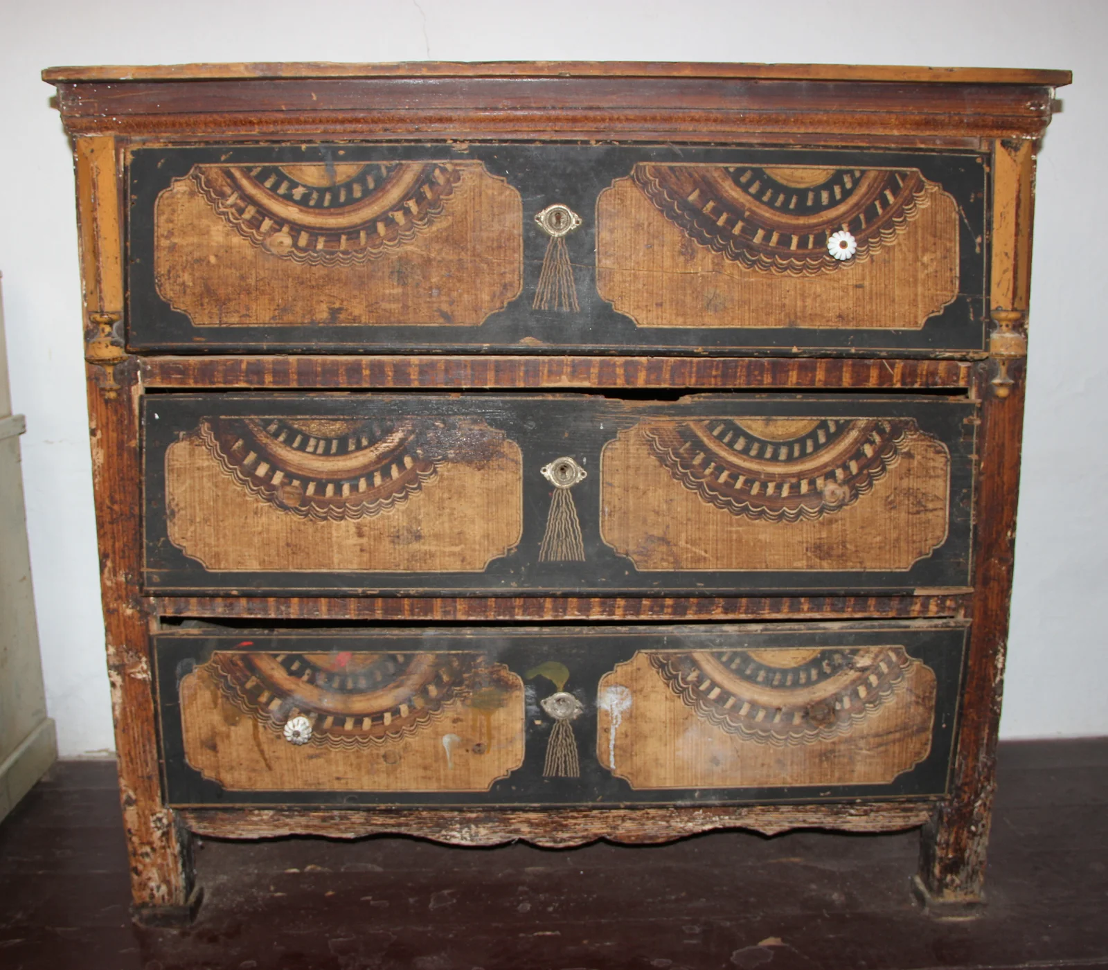 Description: Three-drawer cupboard with porcelain handles. The drawers are decorated with flodering: two cassettes in a black frame, with patterns arranged in a semicircular shape hanging from the top of the cassettes. In the middle of the drawers are keyholes covered by metal plates. On each side, there is a yellow-painted, turned half-column at the height of the upper drawer. It stands on square legs.
