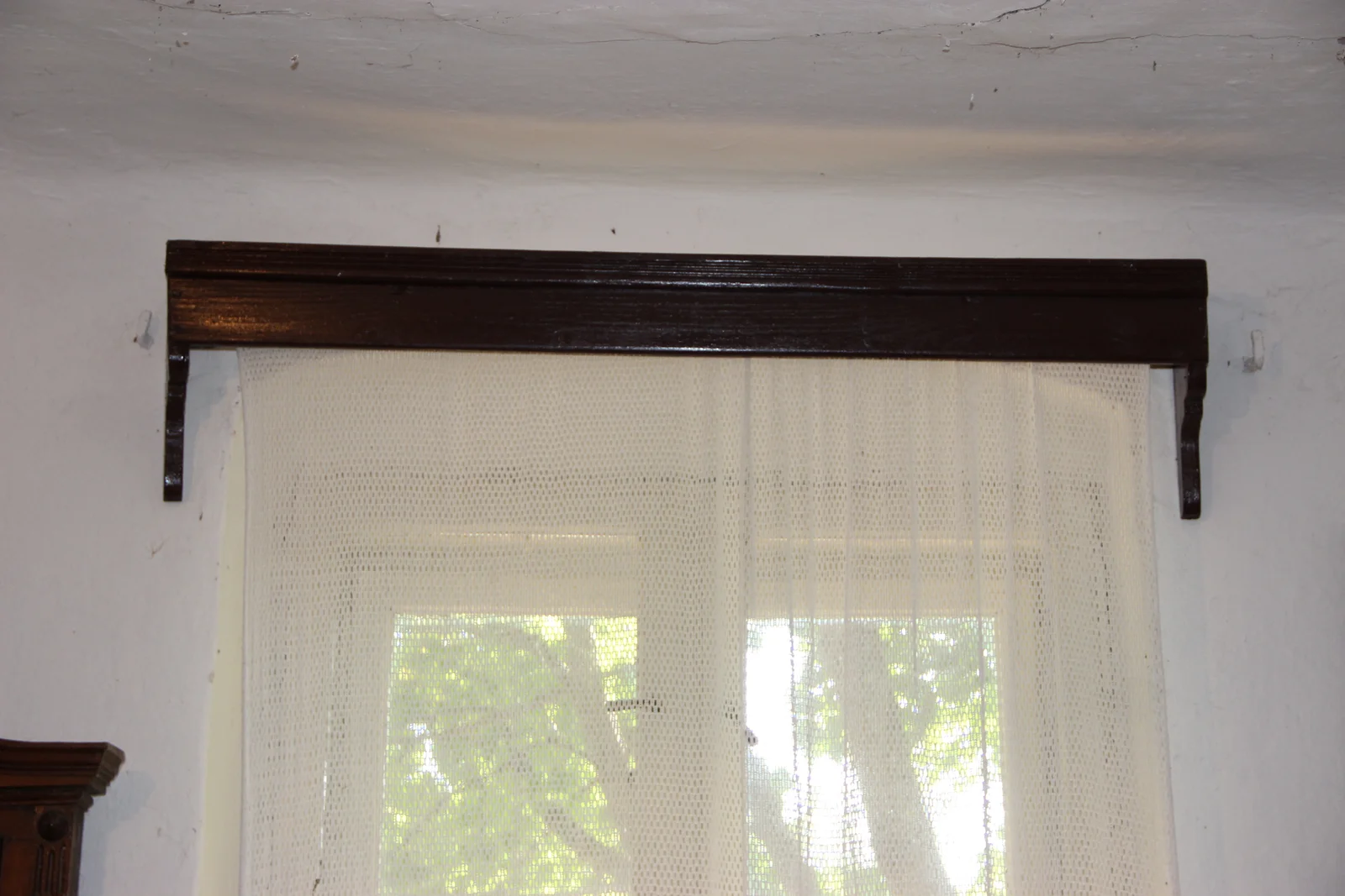 Description: Carpentry work. Painted. Could it belong to a set with the bed? The part leaning against the wall extends further down along the wall.