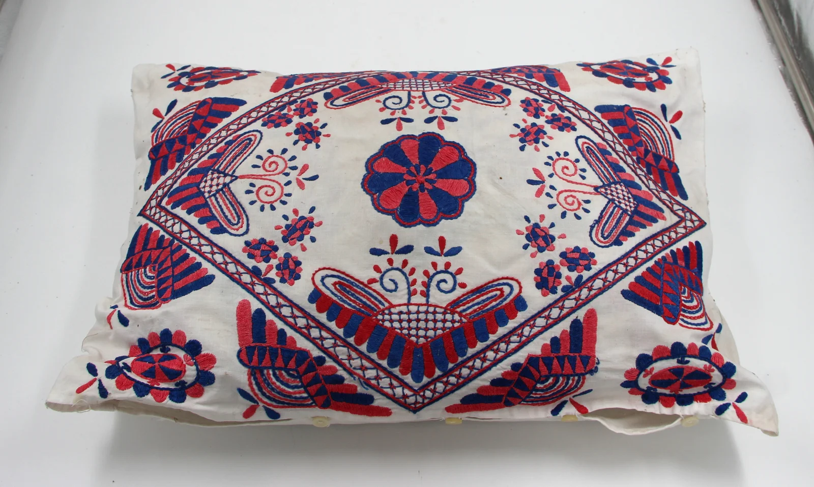 Description: Pillow with Buzsák pattern, embroidered with red and blue thread.