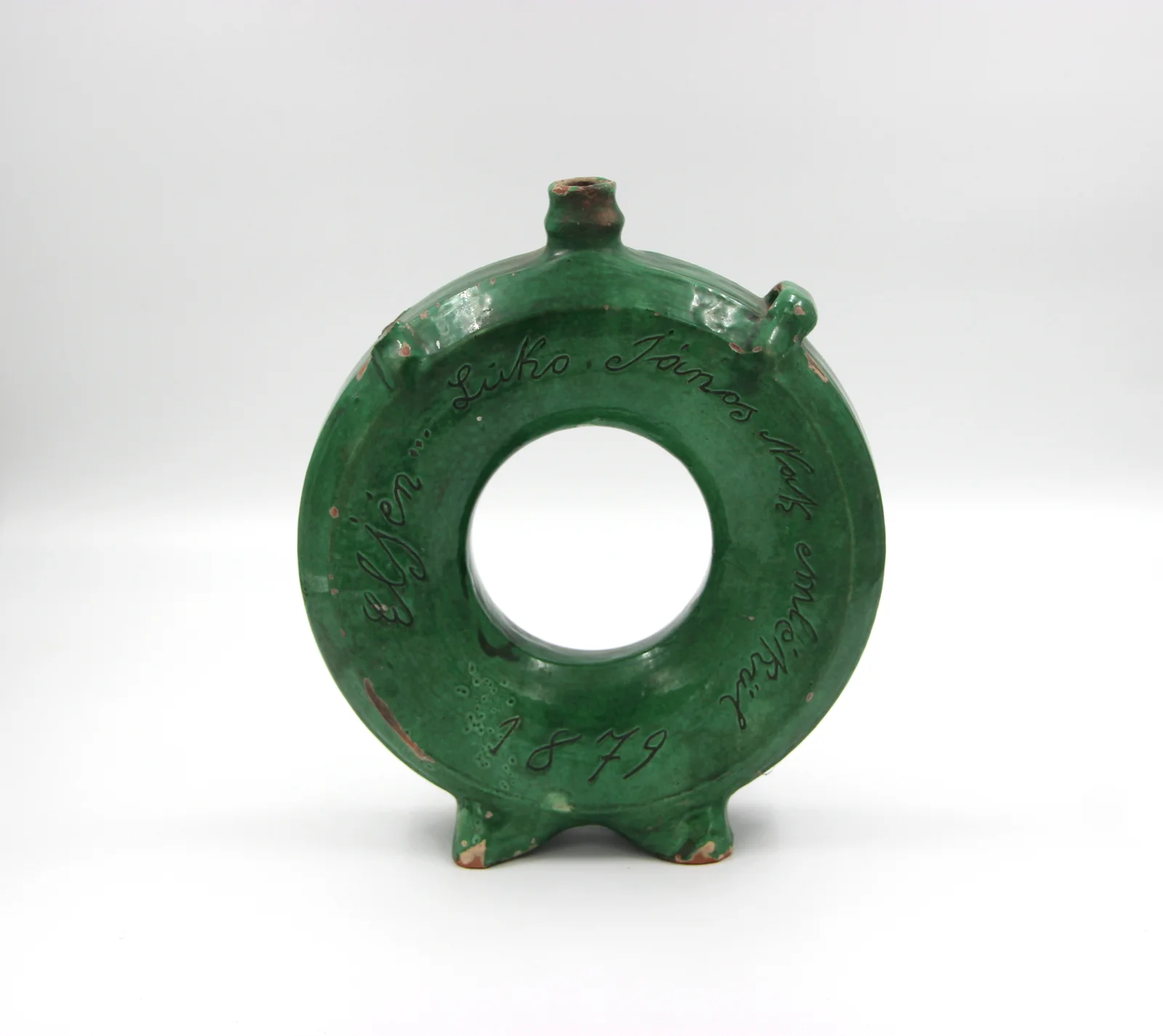 Description: Inscribed with: "Éljen Luko János Nak emlékül 1879" (Long live János Luko in memory of 1879). It likely bears the name of a best man. It has four feet, two of which have significant enamel chipping. On the other side, there is a wreath made of leafy branches with a small, stylized grape pattern. Green glazed. One of its handles, into which a ribbon was threaded, is broken off.