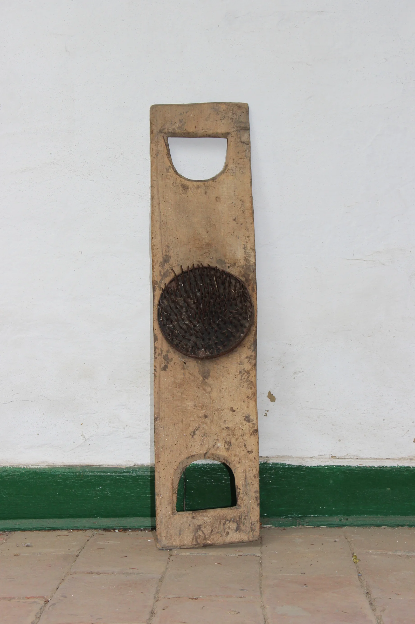 Description: The wooden part has an arched opening on each side for handling. Its comb part is rose-patterned, with denser teeth. Homemade.