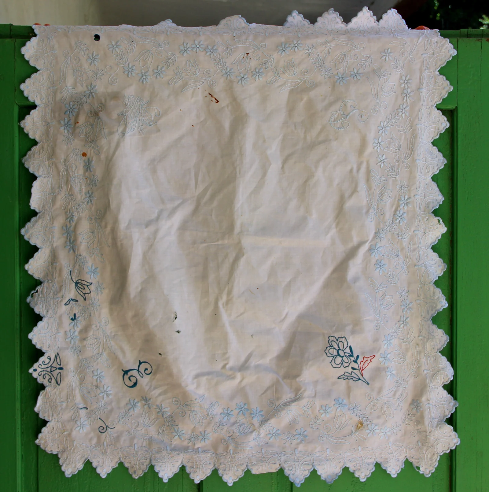 Description: Light blue, made with cottony, shiny embroidery thread faded to various shades. Its pattern is a flowing line, interwoven from a floral garland and a tulip garland. It was sewn with stem stitch and satin stitch. The border pattern filling the scallops consists of winding lines, triangles, and horizontal oval, somewhat droplet-like shapes. In two opposite corners are the letters B and E. In the other two corners, there is a single flower and a pair of birds. Stained with grease and rust, torn in some places.
