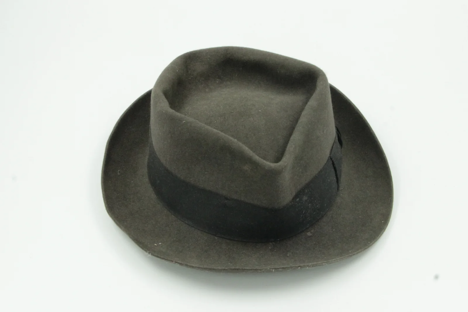 Description: Brown felt. Indented top. Decorated with dark brown silk ribbon. Inscription inside: "Picadily"