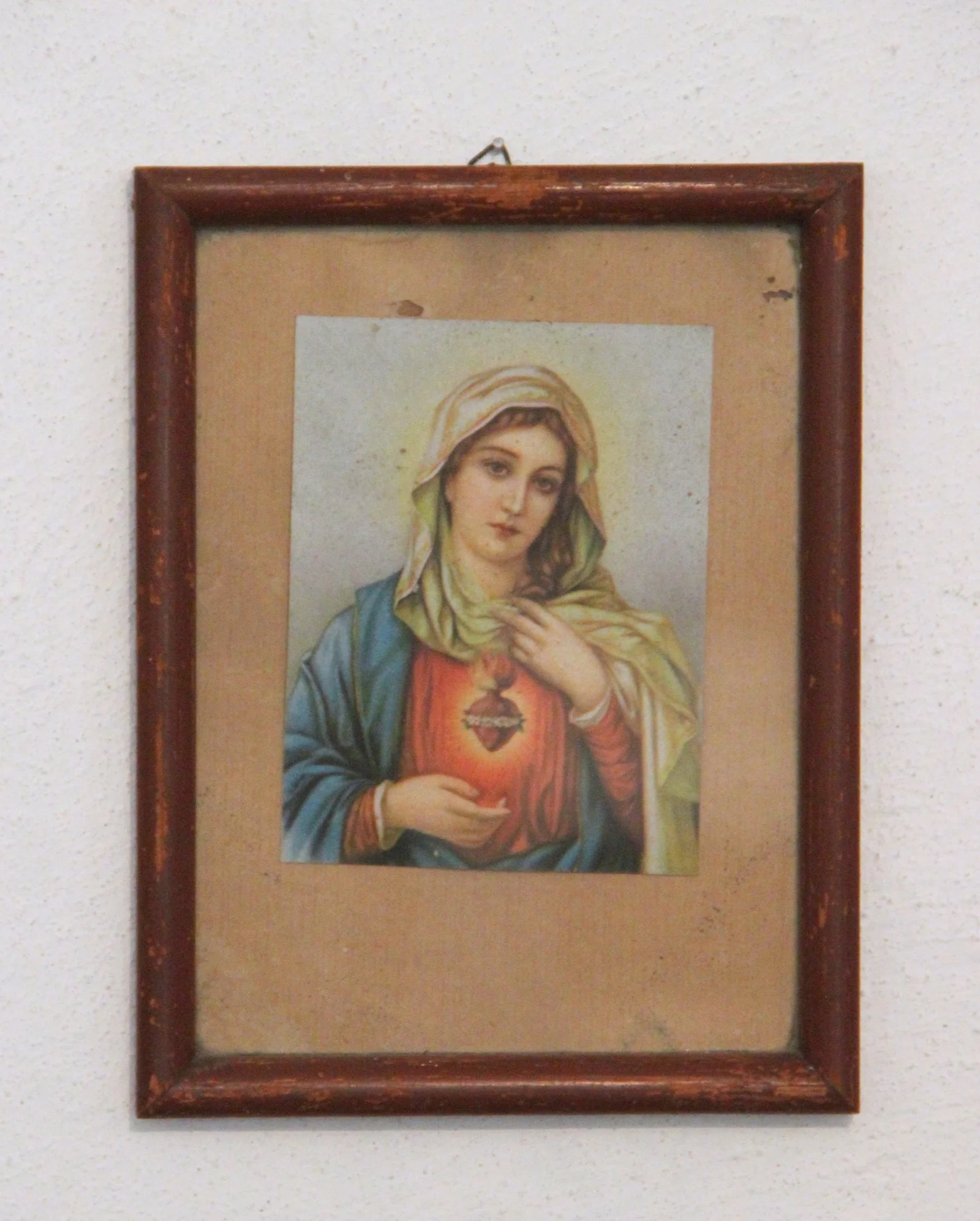 Description: Framed holy picture, with a natural passe-partout behind it, in a simple wooden frame.