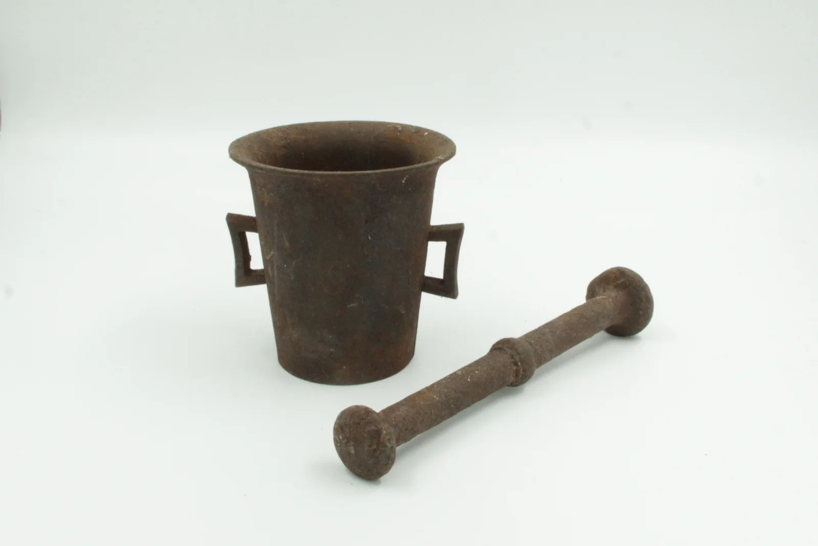 Description: Very rusty. Both handles are present, rectangular in shape. The number 5 is on its side. The thicker part of the pestle is damaged.