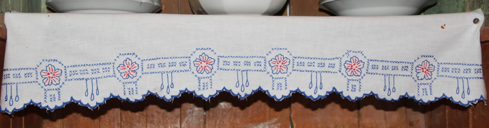 Description: Made with blue thread. Cross-stitch pattern, but not counted. Five-petaled flowers in a geometric pattern, with 5 berries and two blue lines with red.
