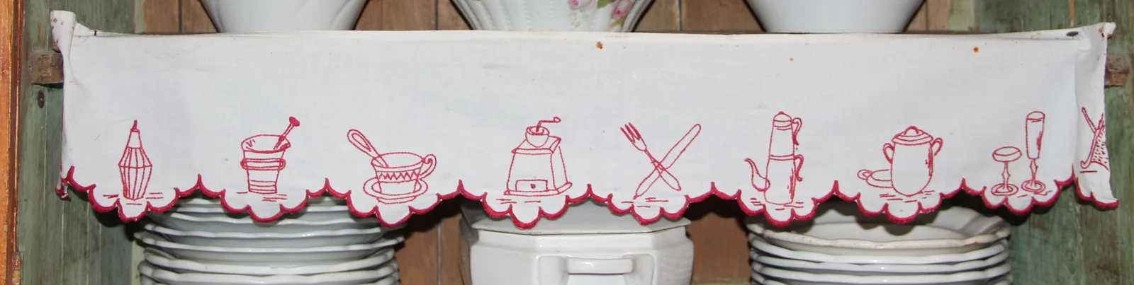 Description: Embroidered with red thread in stem stitch. Motif: kitchen utensils