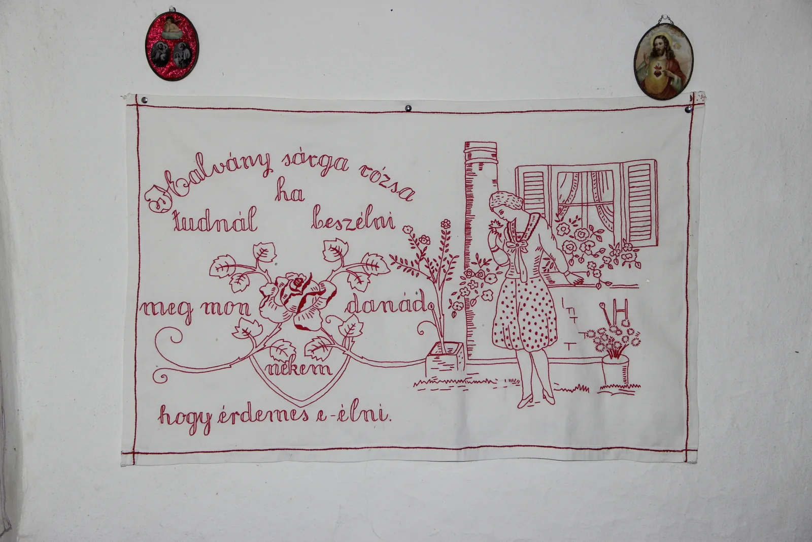 Description: Made with stem stitch and red embroidery thread. Inscription: "Pale yellow rose, if you could speak, you would tell me if life is worth living." It depicts a female figure in front of a floral window. The text is complemented by a rose motif. Edged with chain stitch.