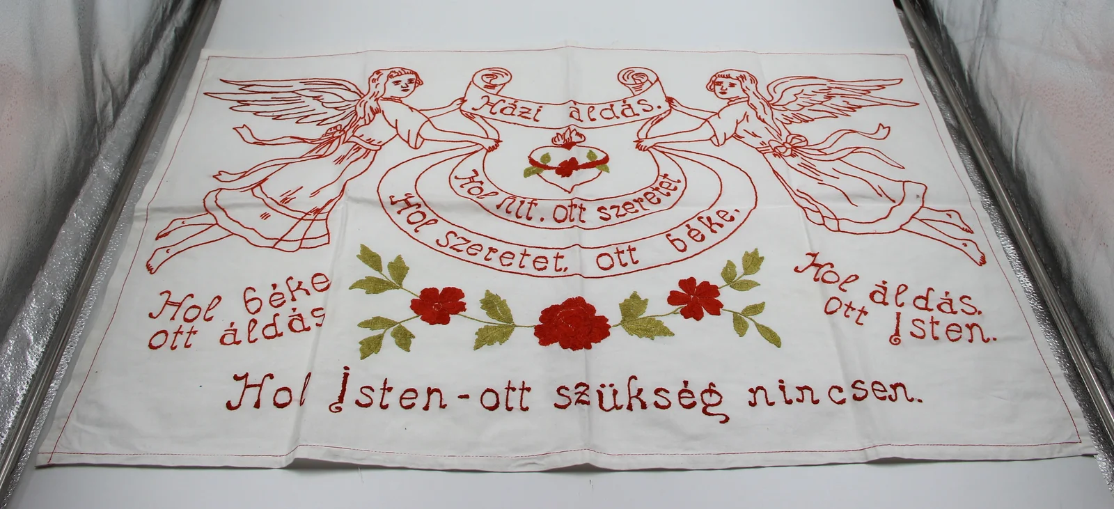 Description: Its text: "House blessing / where there is faith there is love etc." Embroidered in red and green. Two angels hold the ribbon with the text on it. Its pattern matches wall protector no. 232.