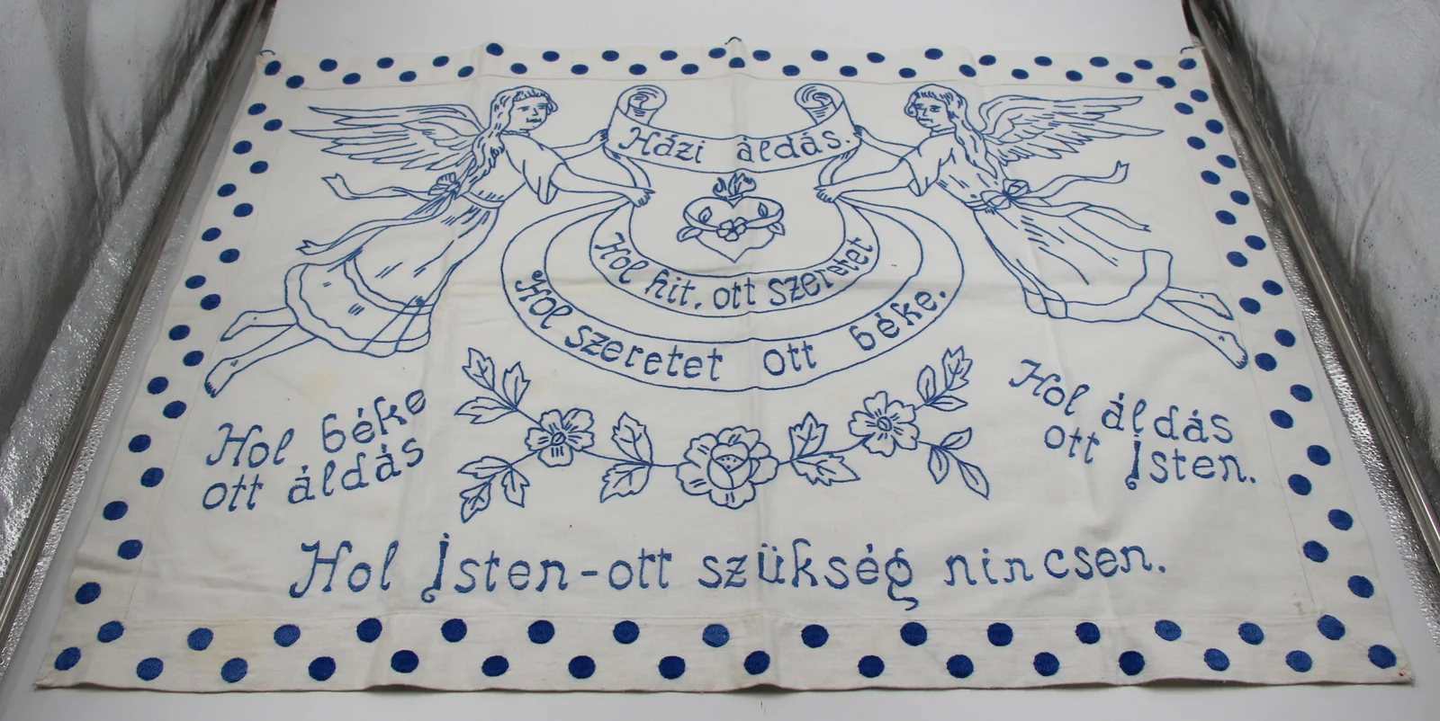 Description: Text: "House blessing / where there is faith there is love etc." Embroidered in blue. Two angels hold the ribbon with the text on it. On the hemmed part, large, dense, flat-stitched dots are embroidered.