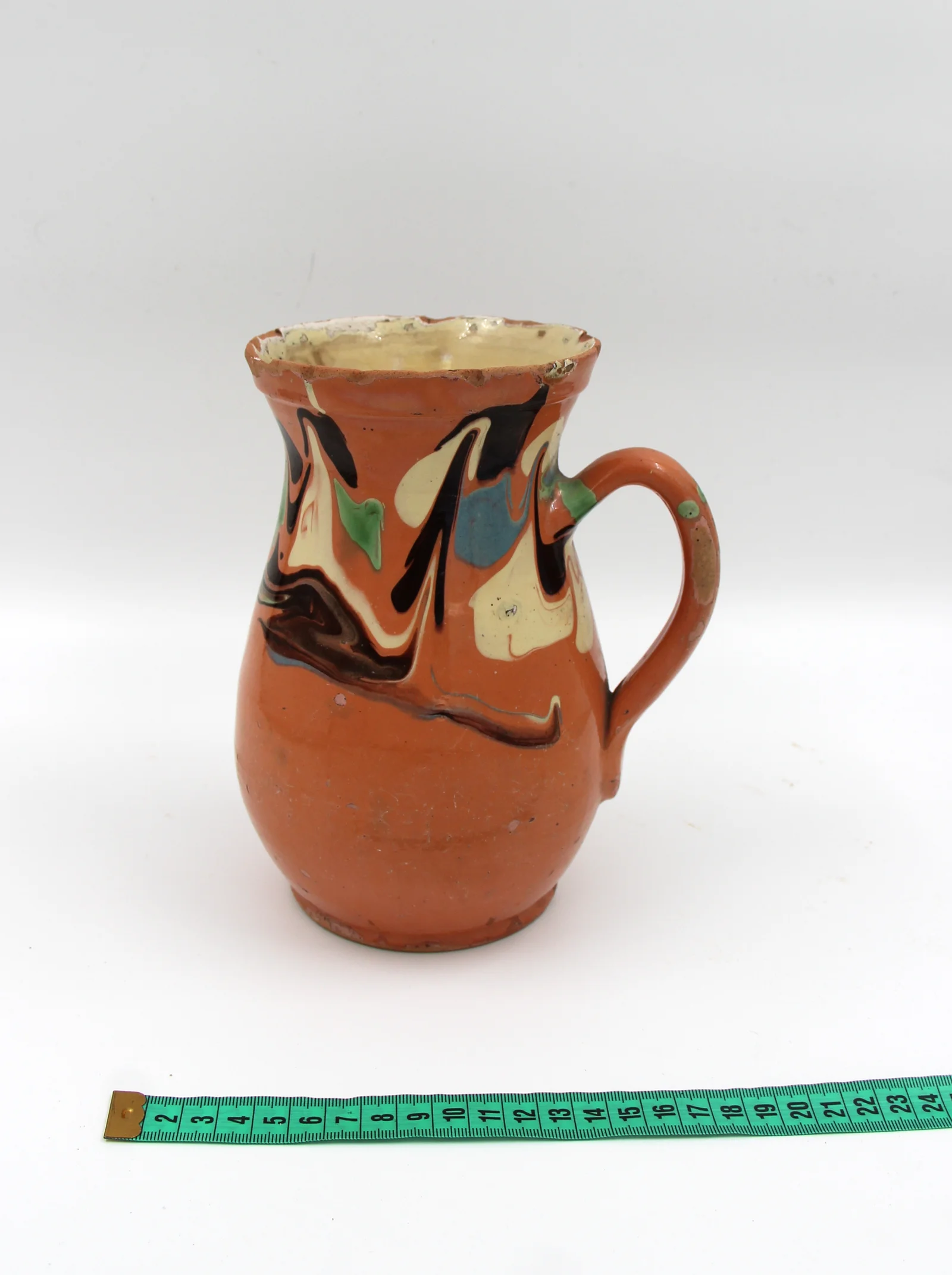 Description: Glazed inside and out. The outer glaze has a poured pattern, the handle extends from the neck to the belly.