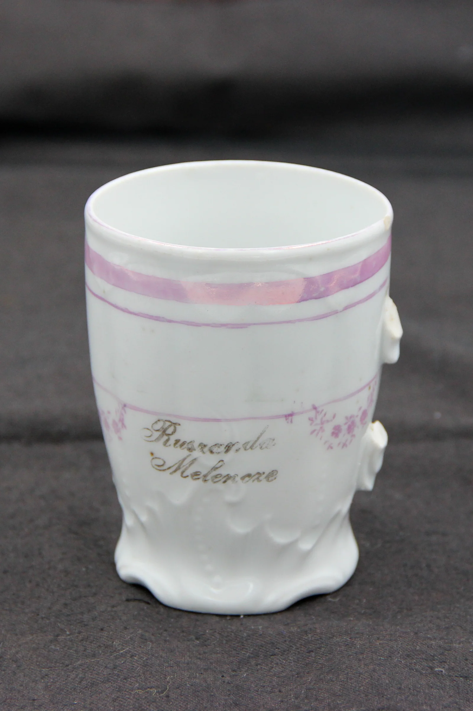 Description: Base mark: "Austria" and W in a bottle shape. Inscription on the side: "Ruszanda Melencze". Pattern: two purple stripes below the rim, one stripe on the belly, with a small floral garland below it up to the inscription. Pressed pattern on the bottom. The handle is broken.