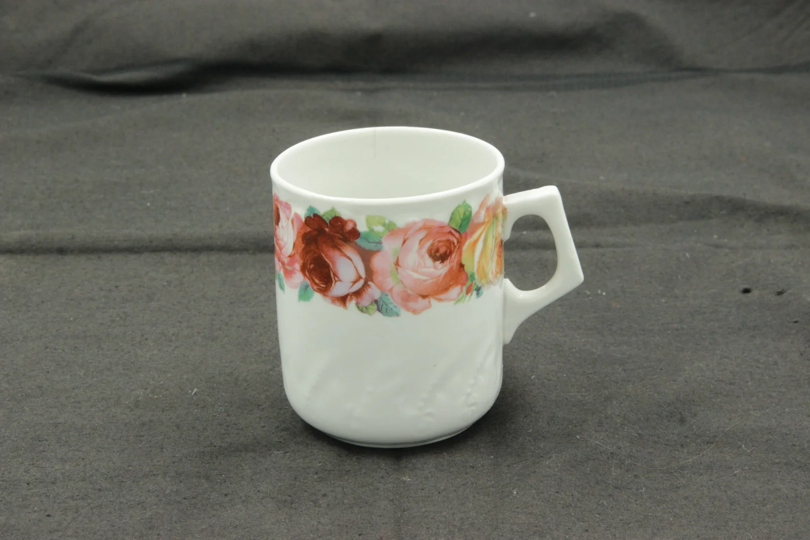 Description: Pattern consists of a band of large roses running around below the rim. Pressed pattern on the bottom. With a rectangular handle.