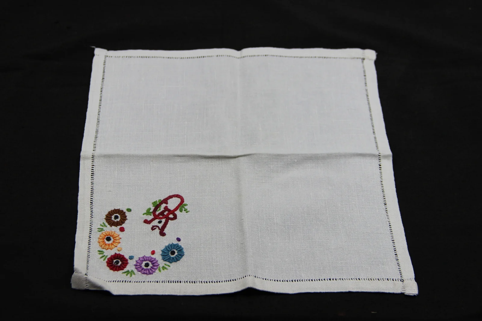 Description: With openwork border. There is a needlepoint pattern in one corner: Monogram O R. With colorful red burgundy shaded thread.