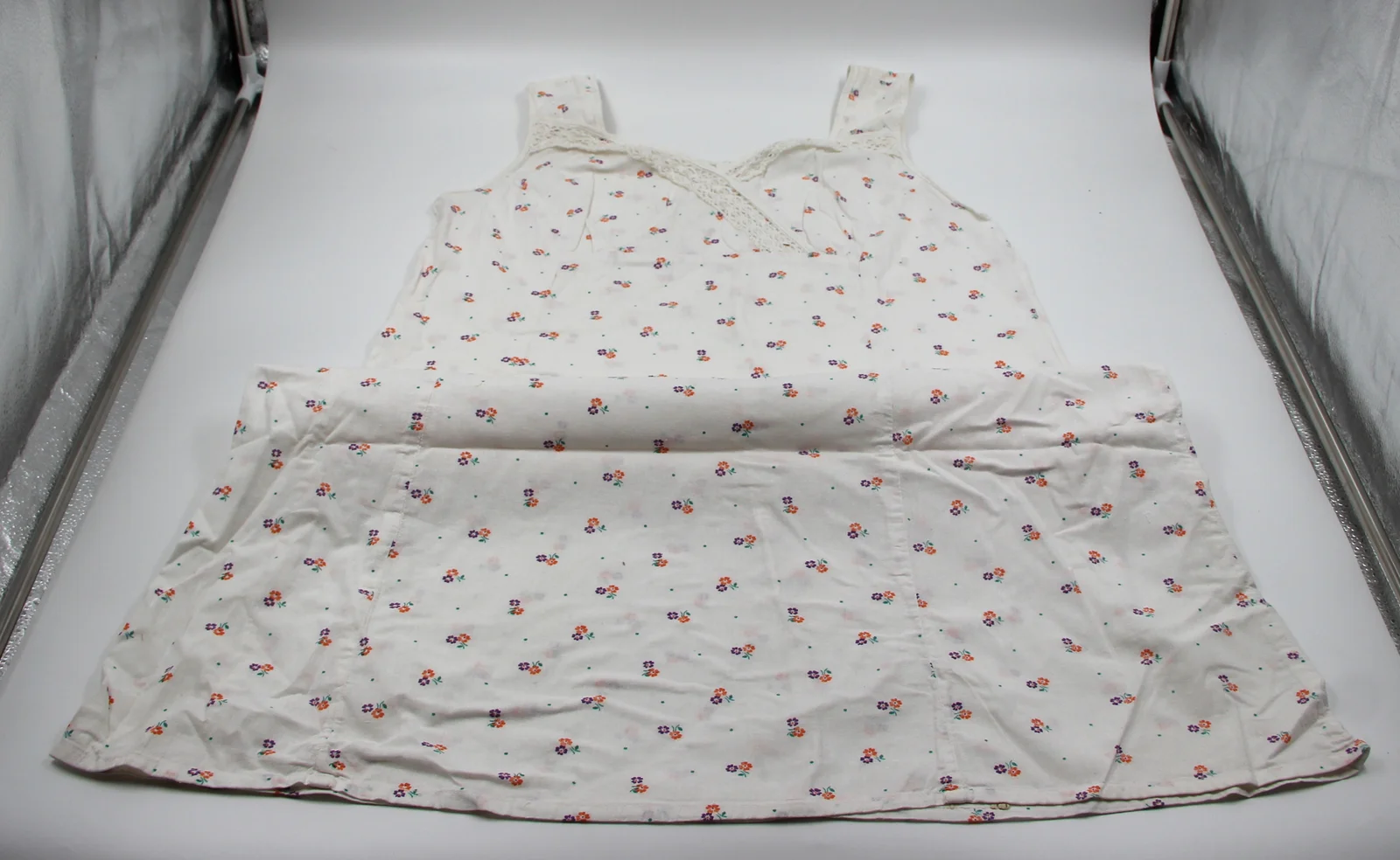 Description: V-neck, consisting of two overlapping parts at the neckline and bust, both decorated with crocheted lace made of thick thread. White background with a small floral pattern. Unstitched at both armholes.