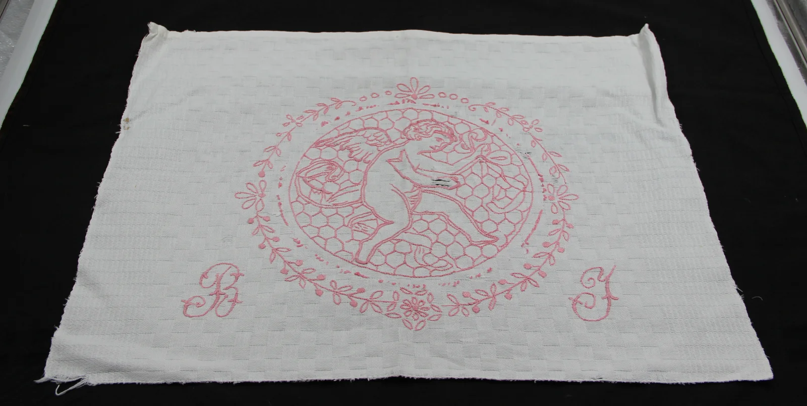 Description: Putto in a round frame, with red embroidery thread, stem stitch. Monogram: B J. Unusual execution.