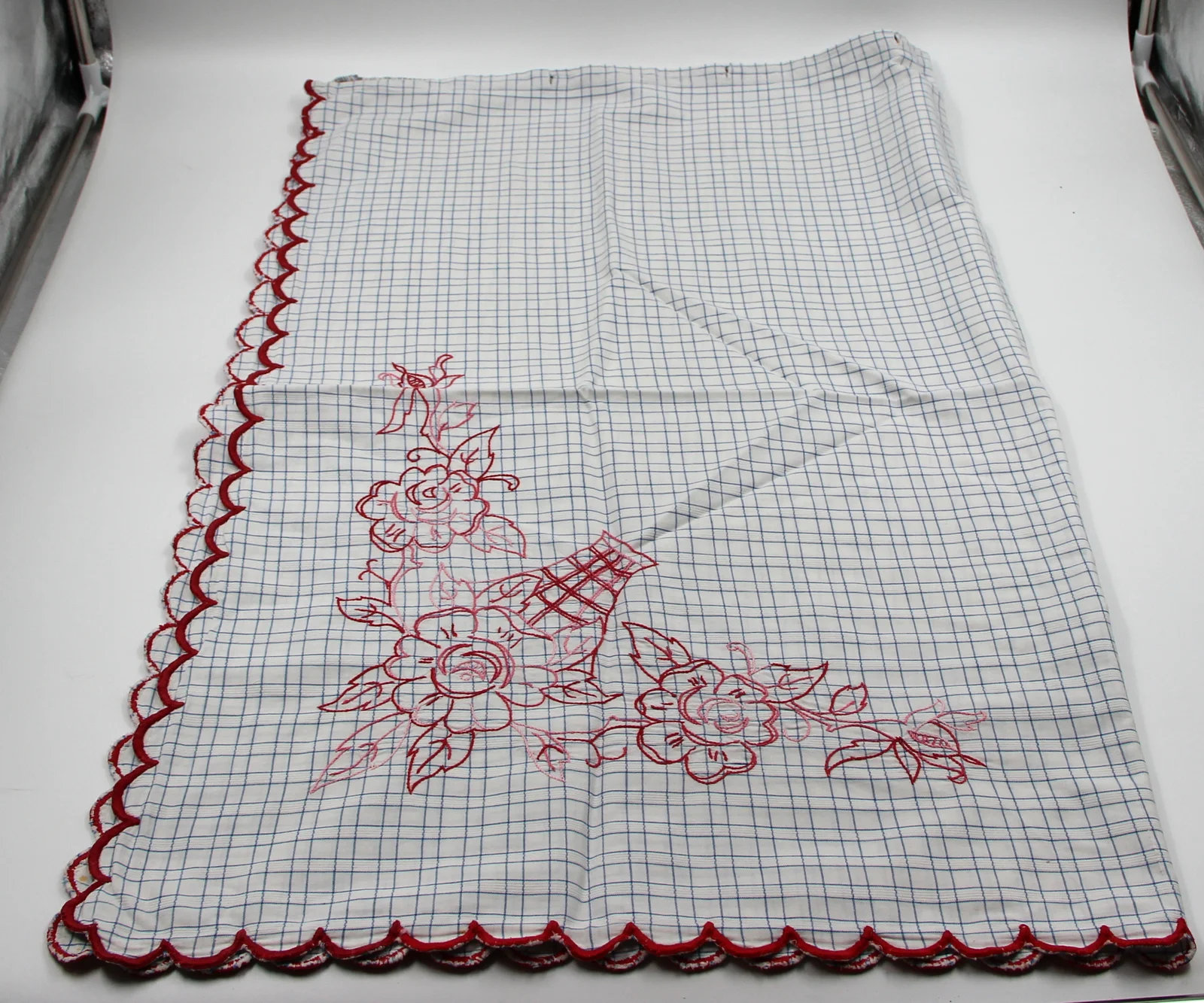 Description: The pillowcase is decorated. Sewn with red shaded embroidery thread. The material is blue checkered canvas. Large rose motifs arranged in baskets in two corners.