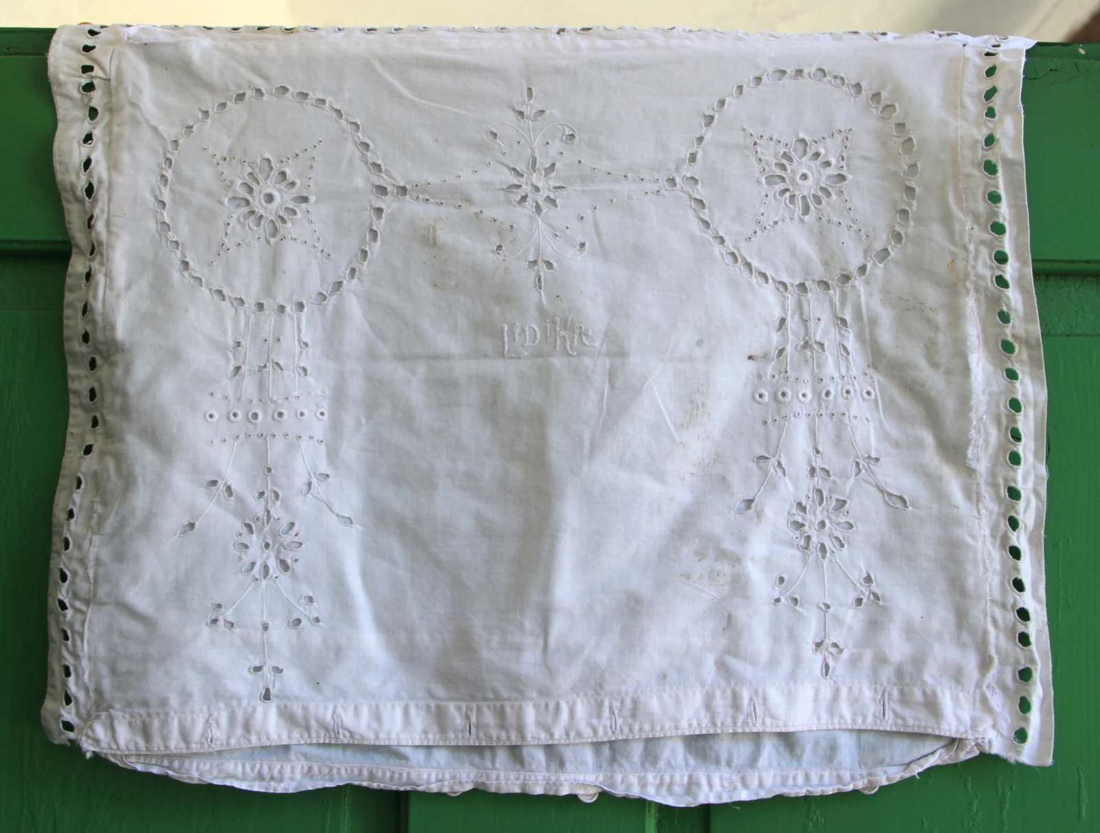 Description: Buttons at the bottom. White eyelet embroidery. Inscription: "Lidika". Clumsily executed, its edge is decorated with a row of straight eyelets. On the pillow front, in two corners, flowers are inserted into circles, with similar flower motifs hanging downwards from them.