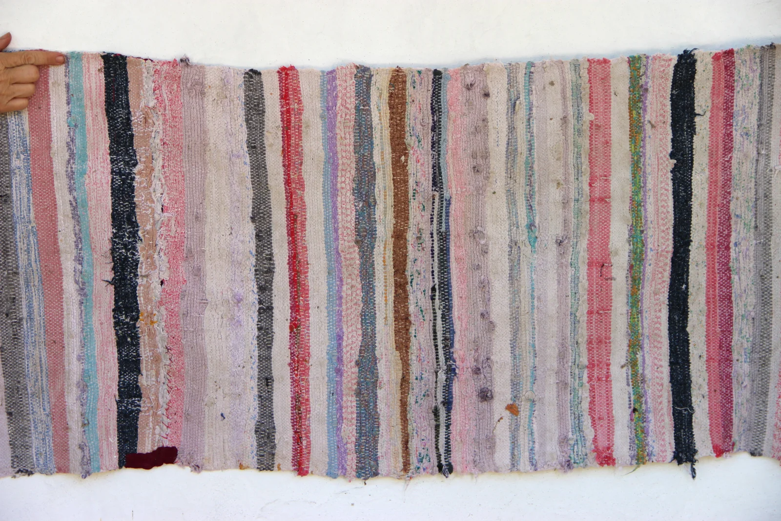 Description: Many colours alternate in thin stripes: black, white, red, green, brown, blue... Both ends are fringed.