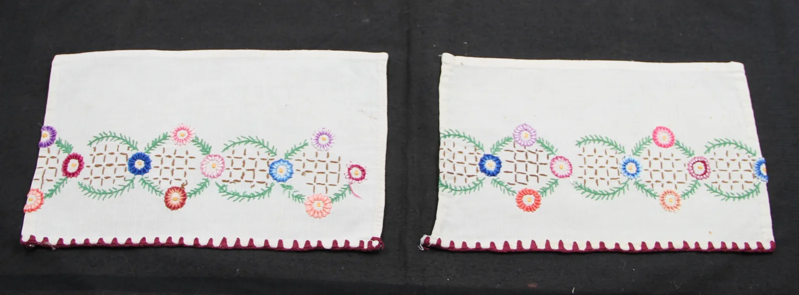 Description: Shelf strip cut into three, hemmed. Pinpoint flowers with shaded and plain embroidery thread. Crocheted edge with large feet attached.