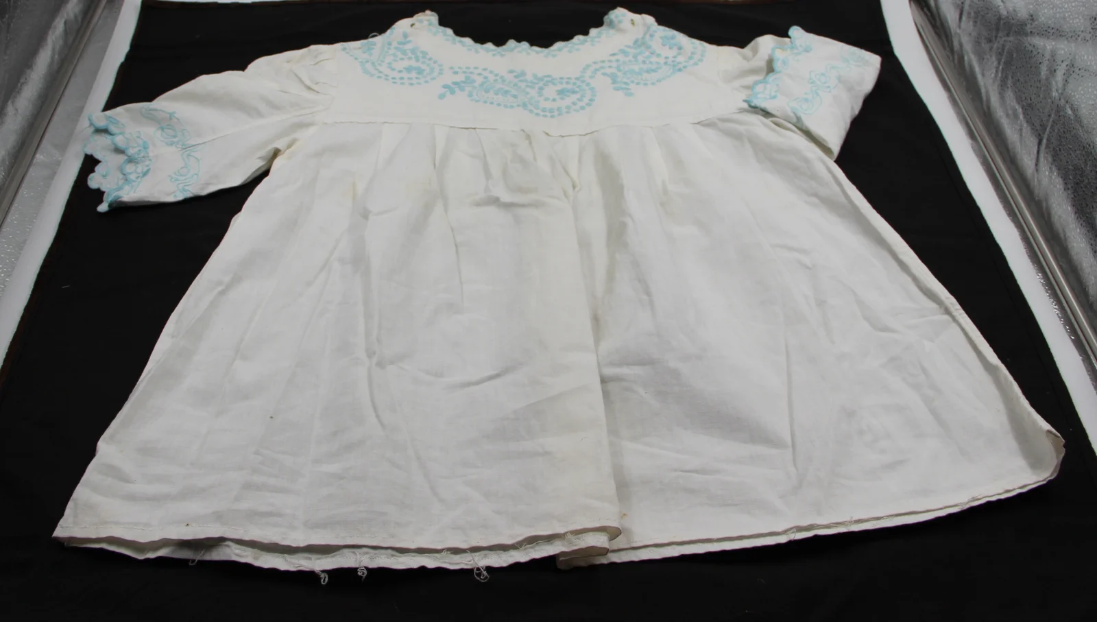Description: Both the back and front are embroidered identically with light blue embroidery thread: eyelet embroidery motif, but the holes are filled. There is also a heart shape within it. At the neckline, there are three dots in each scallop. The sleeve features stem stitch embroidery. It is cut at the bust line, and the bottom is gathered with pleats – this is how it was widened. The sleeve is tailored.