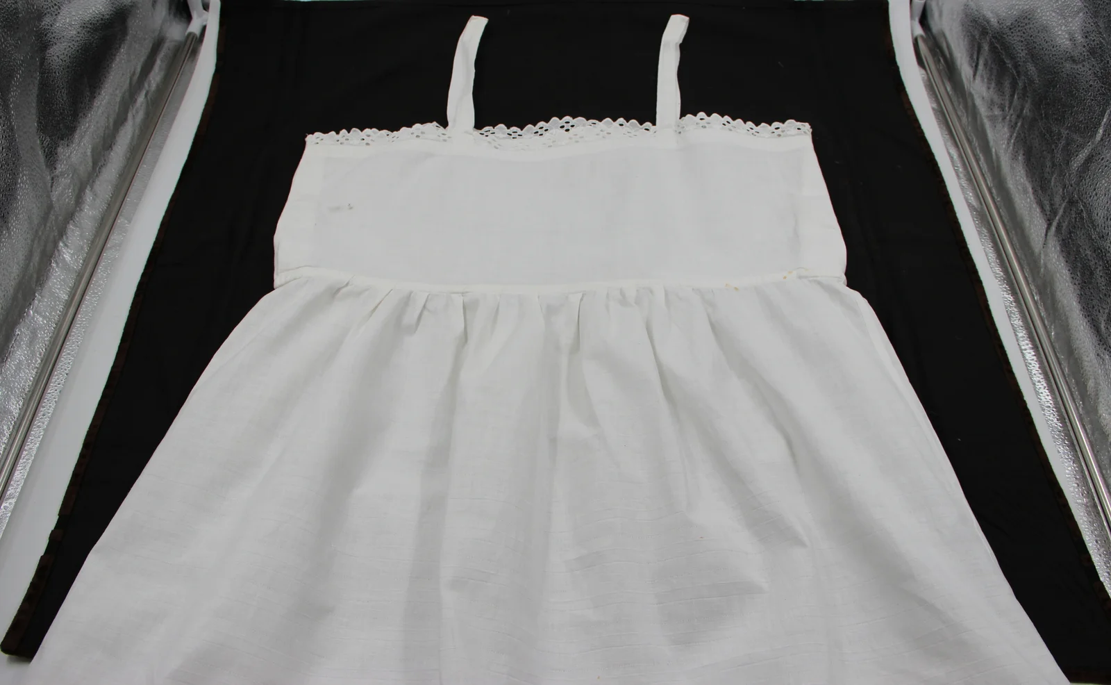 Description: With shoulder straps. Cut and gathered at the waist. The bottom is undecorated. Factory Madeira strip at the top edge. On the front, another short strip of the same factory Madeira strip is sewn on.