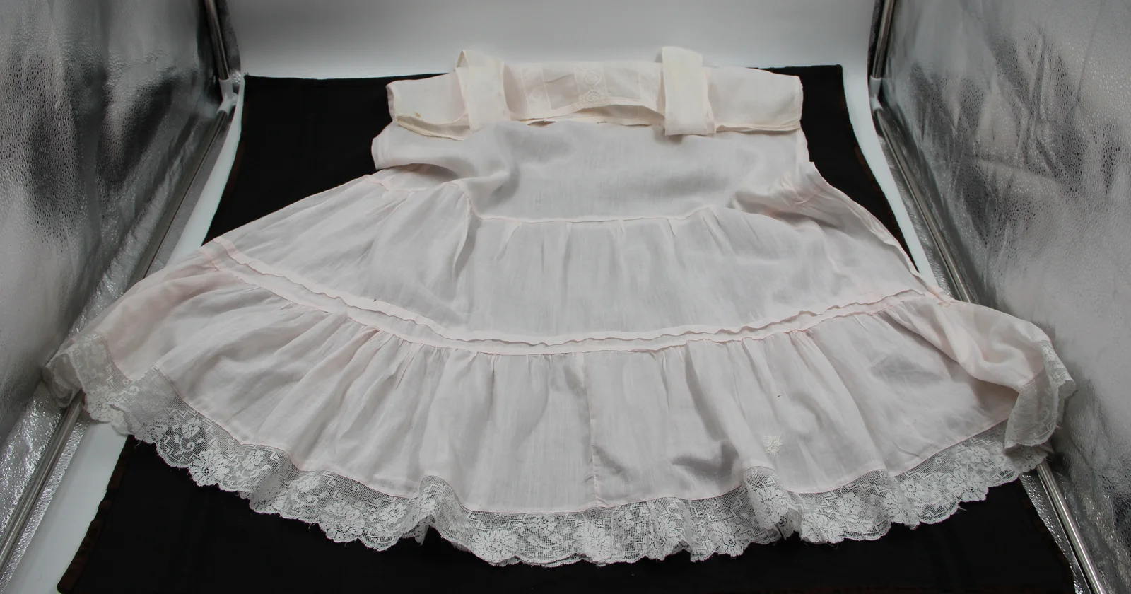 Description: 3-3 delicate factory lace appliques on both the front and back. The central one has a geometric pattern, while the middle one features stylized flowers. Its cut is straight to the hip, widening from the hip with two ruffled sections, one below the other. The bottom is decorated with delicate factory lace. It has straight shoulder straps.