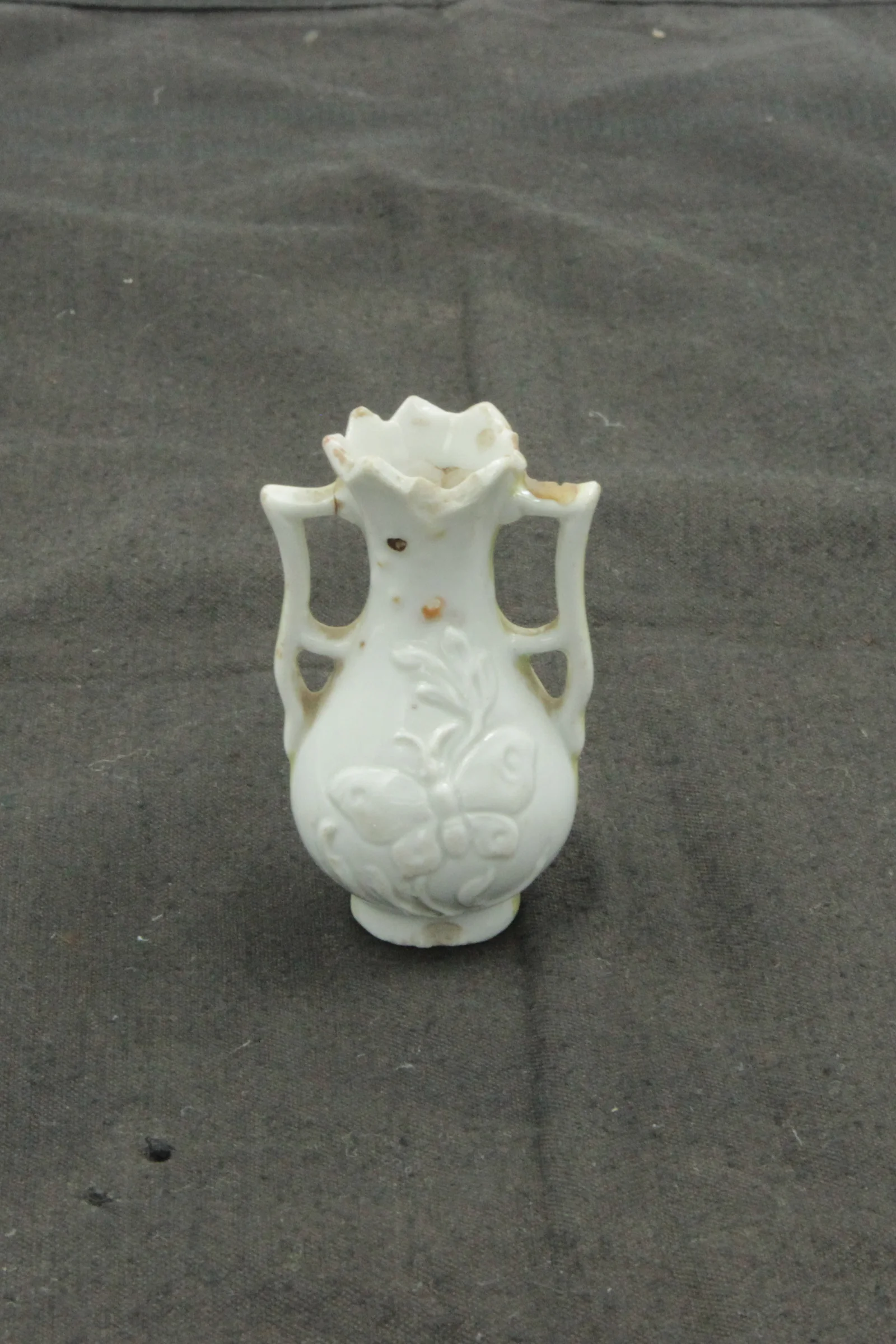 Description: Its pattern is embossed: a bunch of grapes with leaves and tendrils, on the other side a butterfly and plant ornamentation. With an angular handle at the top and a curved one at the bottom. The rim is sharply jagged.
