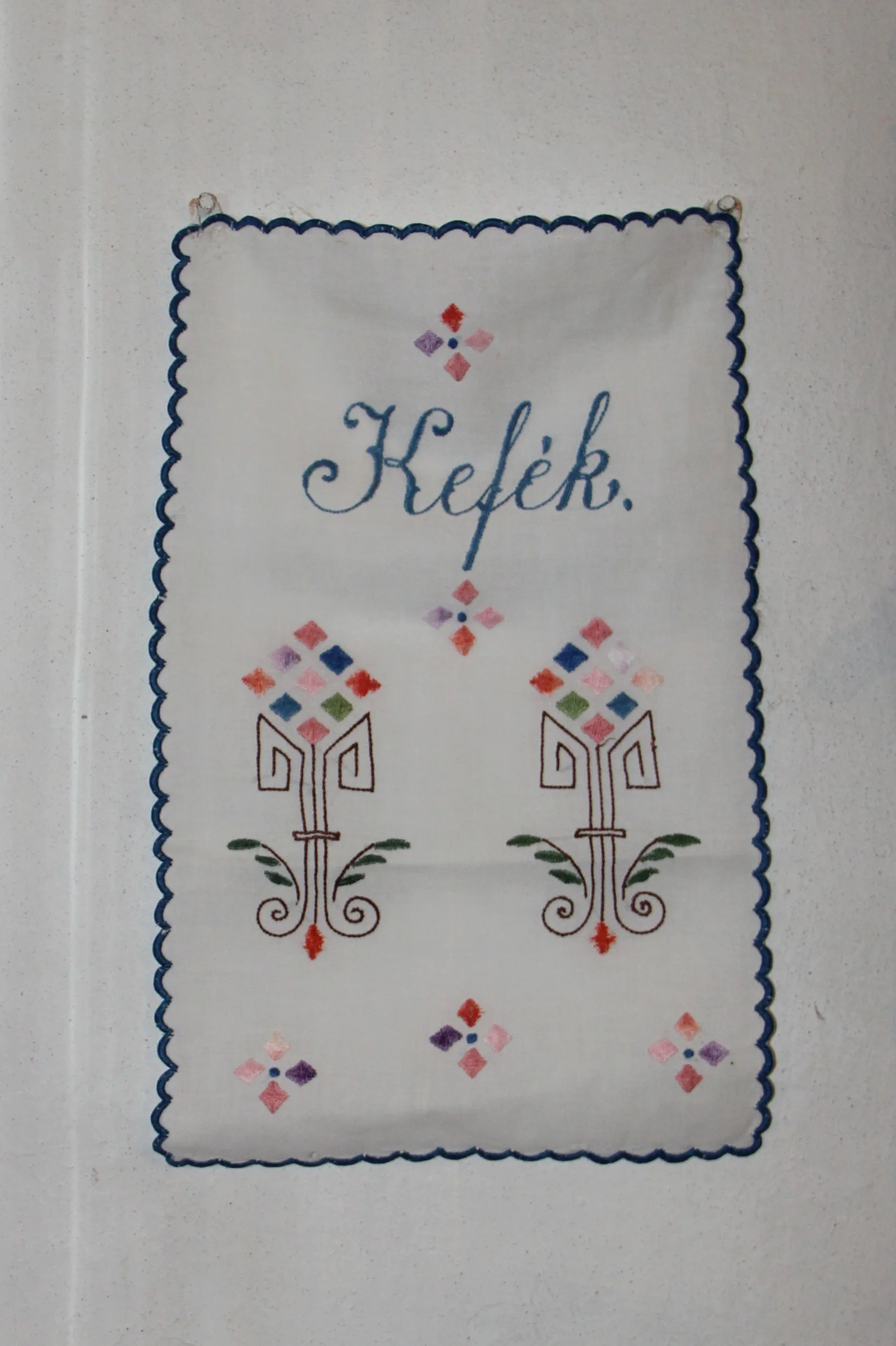 Description: Its scalloped edge and inscription are dark blue. Its inscription: "Brushes" decorated with embroidery. Its motif is arranged in two columns: a rhombus shape composed of smaller rhombuses, angular and wavy lines, leafy branches. Its colors: blue, pink, purple, brown, green. Partially embroidered with shaded thread. It has no pockets.