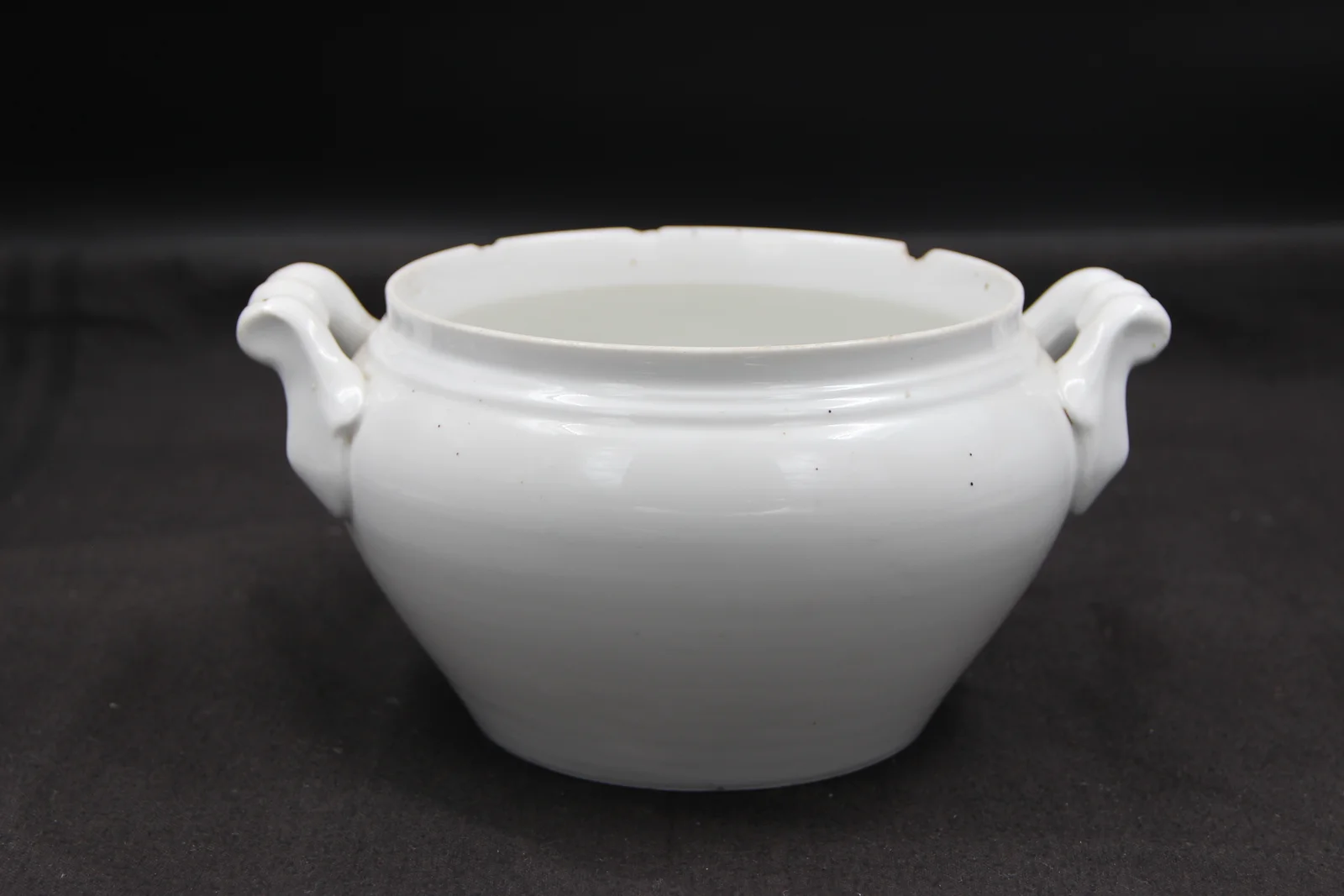 Description: White porcelain. Its two handles rise angularly from the vessel's wall. Its wall is smooth. The rim is chipped in three places. Below the rim, it is decorated with a thicker and a thinner impressed stripe.
