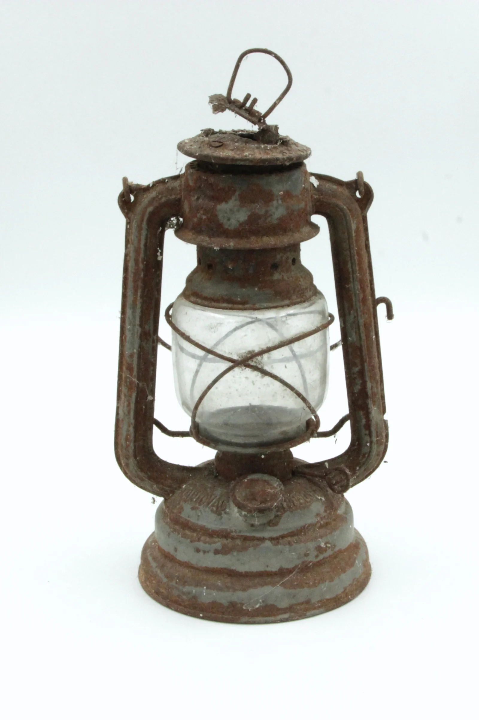 Description: Operated with petroleum. Its glass shade is protected by wire mesh and a metal body. Inscribed on its body: "Karlovac Yugoslavia". Heavily rusted.