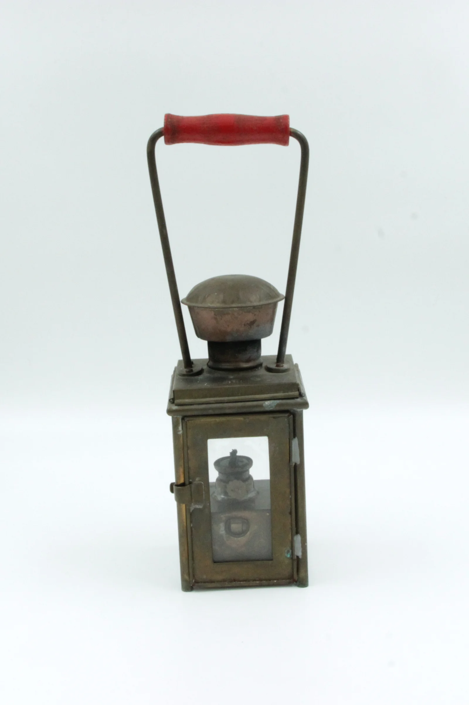 Description: Its body is cabinet-like, glazed on all four sides, with an opening door. It operated on petroleum. Its tank-like lamp part is square and removable. The handle has a red-painted wooden covering. Impressed Cyrillic letters on the top: J Ж [Yugoslav railway company]. In good condition.