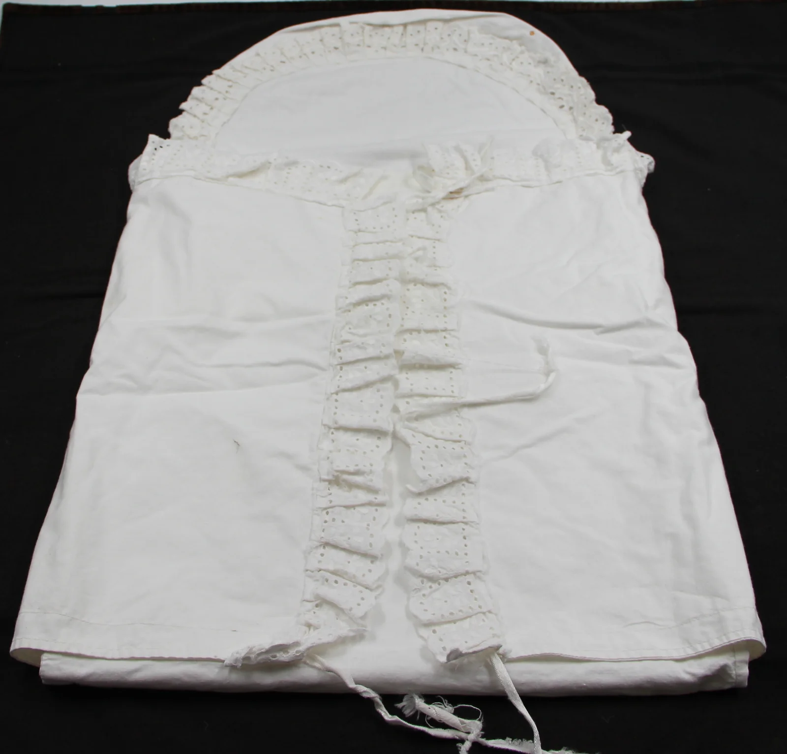 Description: Decorated with factory-made Madeira ribbon. Can be tied with a string. Of more recent origin, perhaps from the 1980s, judging by its form. A duvet can be placed inside.