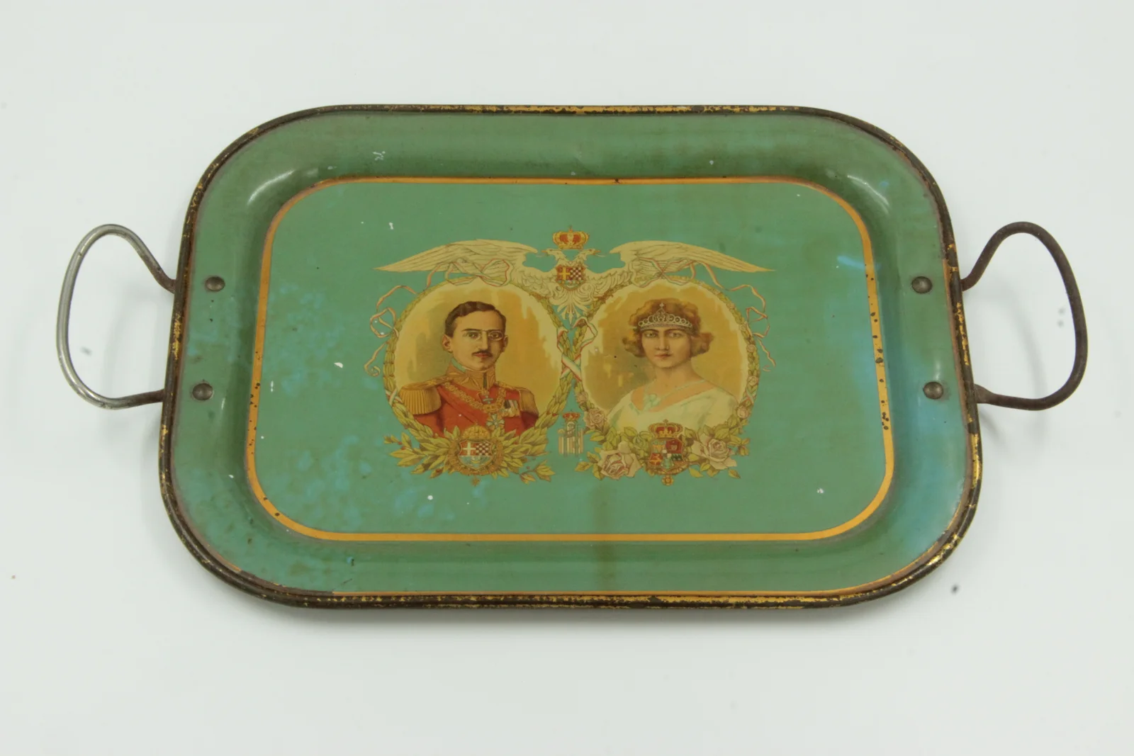 Description: Painted metal tray, with two riveted handles. Its decoration depicts King Alexander I of Yugoslavia and his wife, Queen Maria, with a double-headed eagle with a crown above them, and a coat of arms framed by floral ornamentation below each.