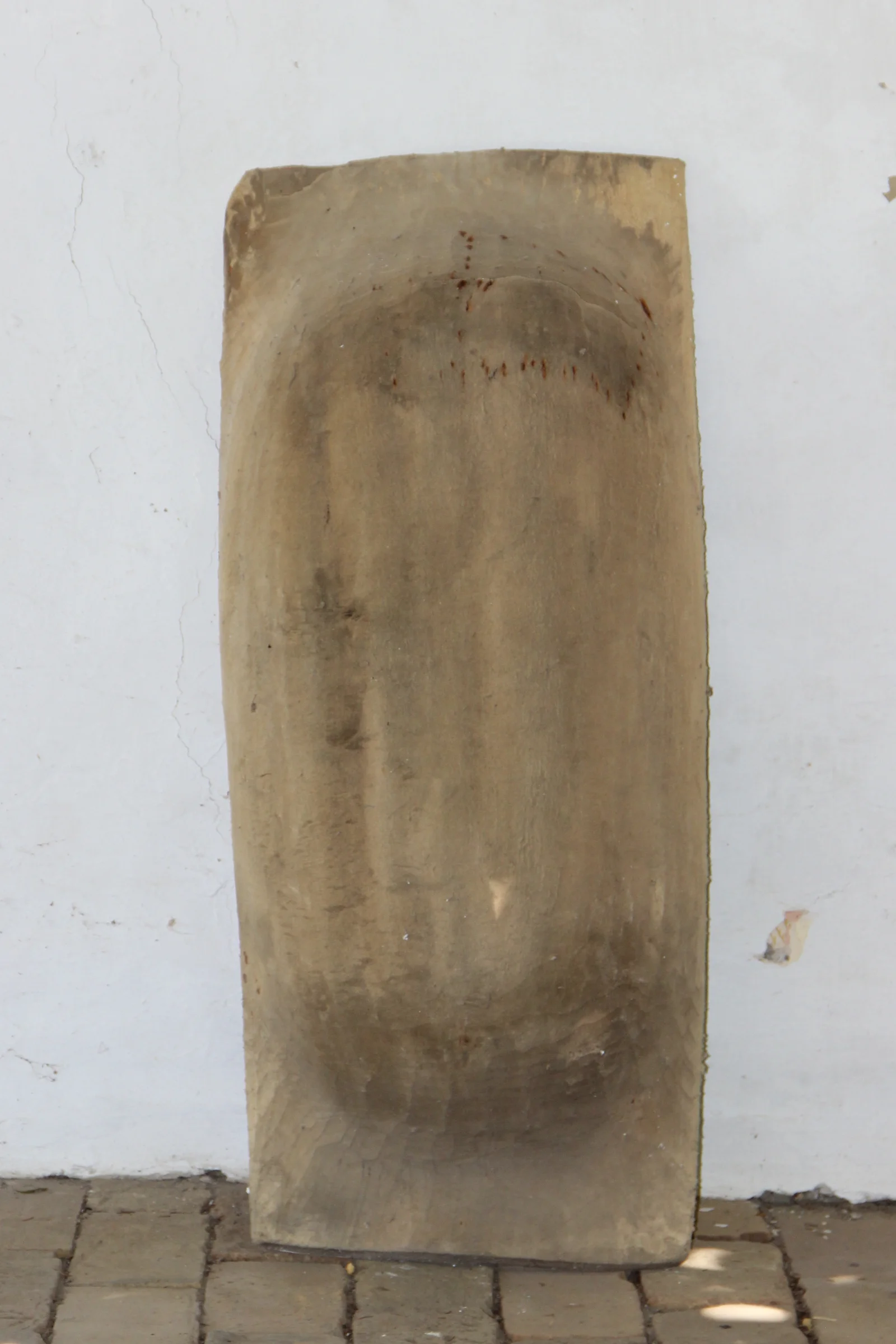 Description: Large wooden trough made of softwood. It has a hole and its shape is warped. Rust stains from nails are visible on the bottom, indicating that it may have been patched.