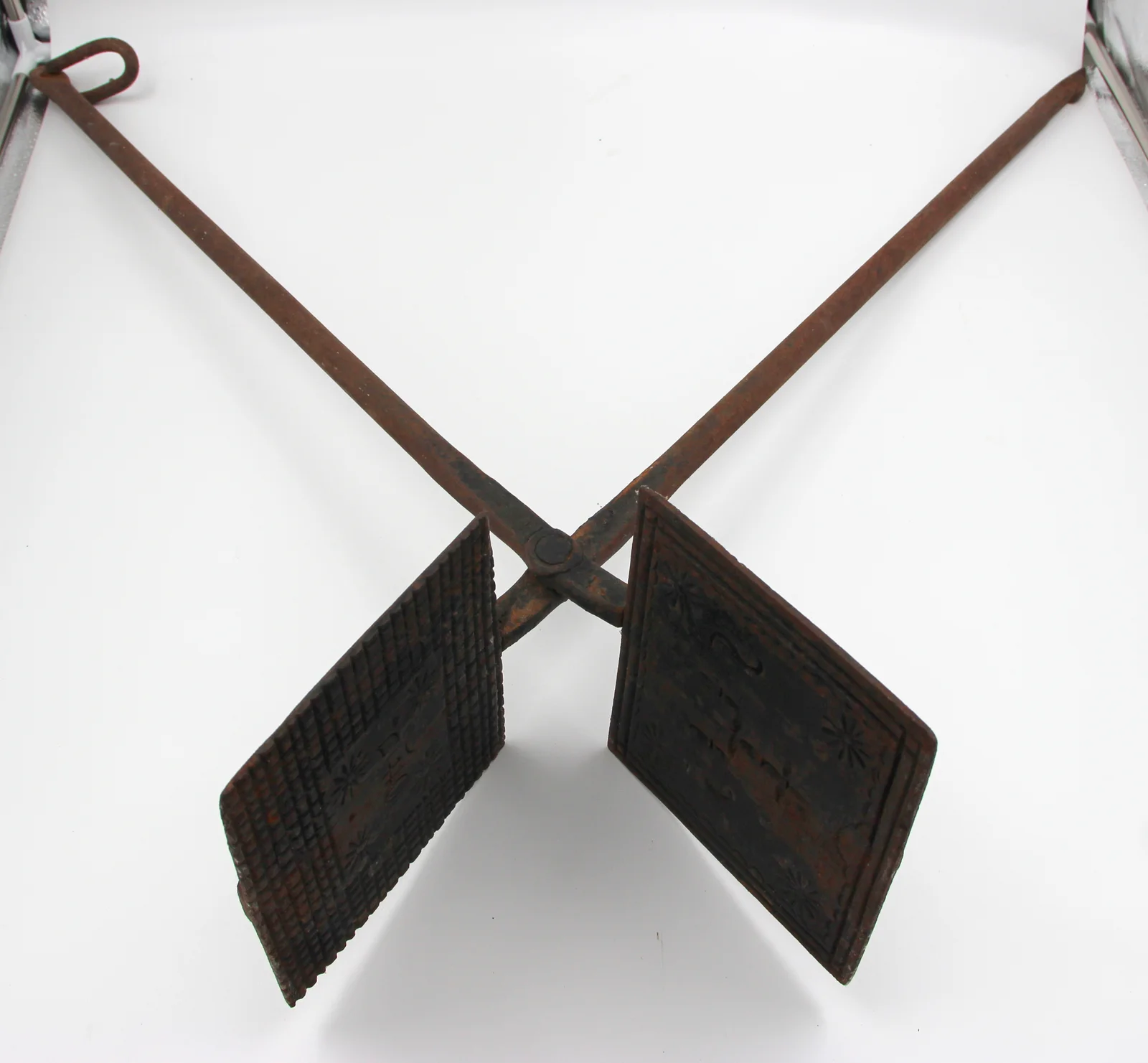 Description: Its inscription on one inner side of the baking part is "IHO", and its pattern consists of floral motifs in the four corners, surrounded by grid lines. Its other baking plate has a larger patterned surface: also flowers in the four corners and a cross shape, framed by two strips each.