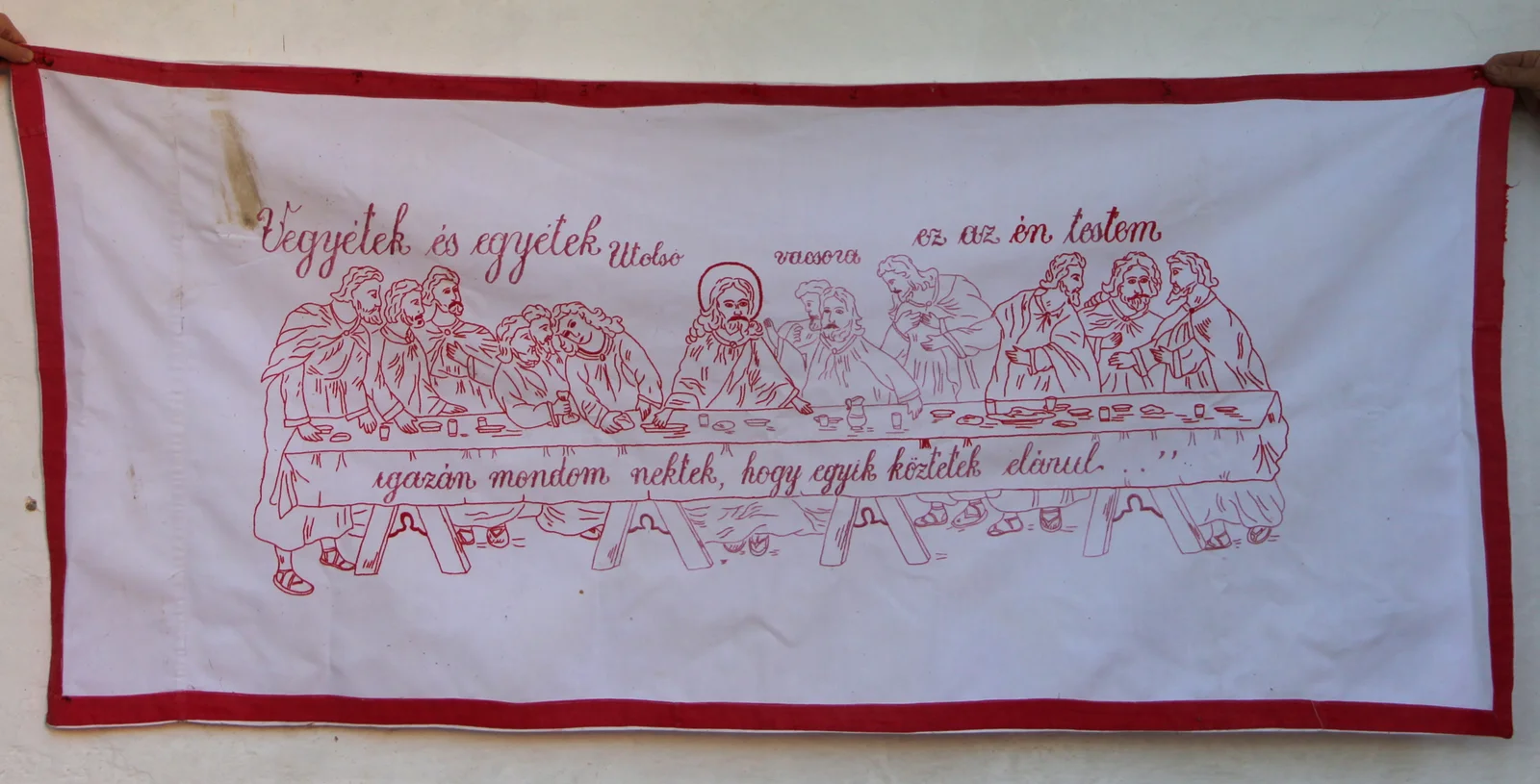 Description: Pattern: Last Supper. Inscription: "Take, eat; this is my body / Last Supper / Truly I tell you, one of you will betray me." Embroidered with red pearl thread faded to various shades. Edged with red fabric. Originally placed above a bed or couch, in the Kisorosz local history museum it was on the wall section above the small table.