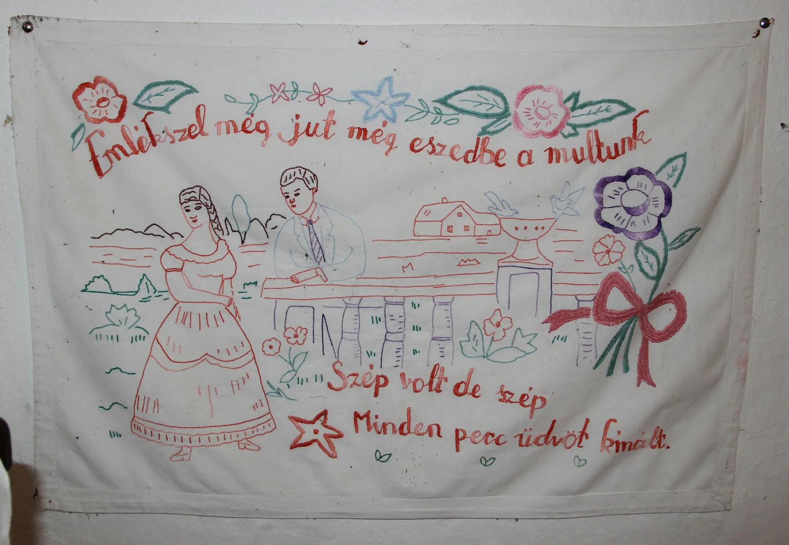 Description: With colorful embroidery. Text: "Do you still remember, do you still recall our past. It was beautiful, so beautiful, every moment offered bliss." In red letters. Motif: male and female figures, with a village scene behind them. Flowers above the letters. Partially embroidered with shaded thread.