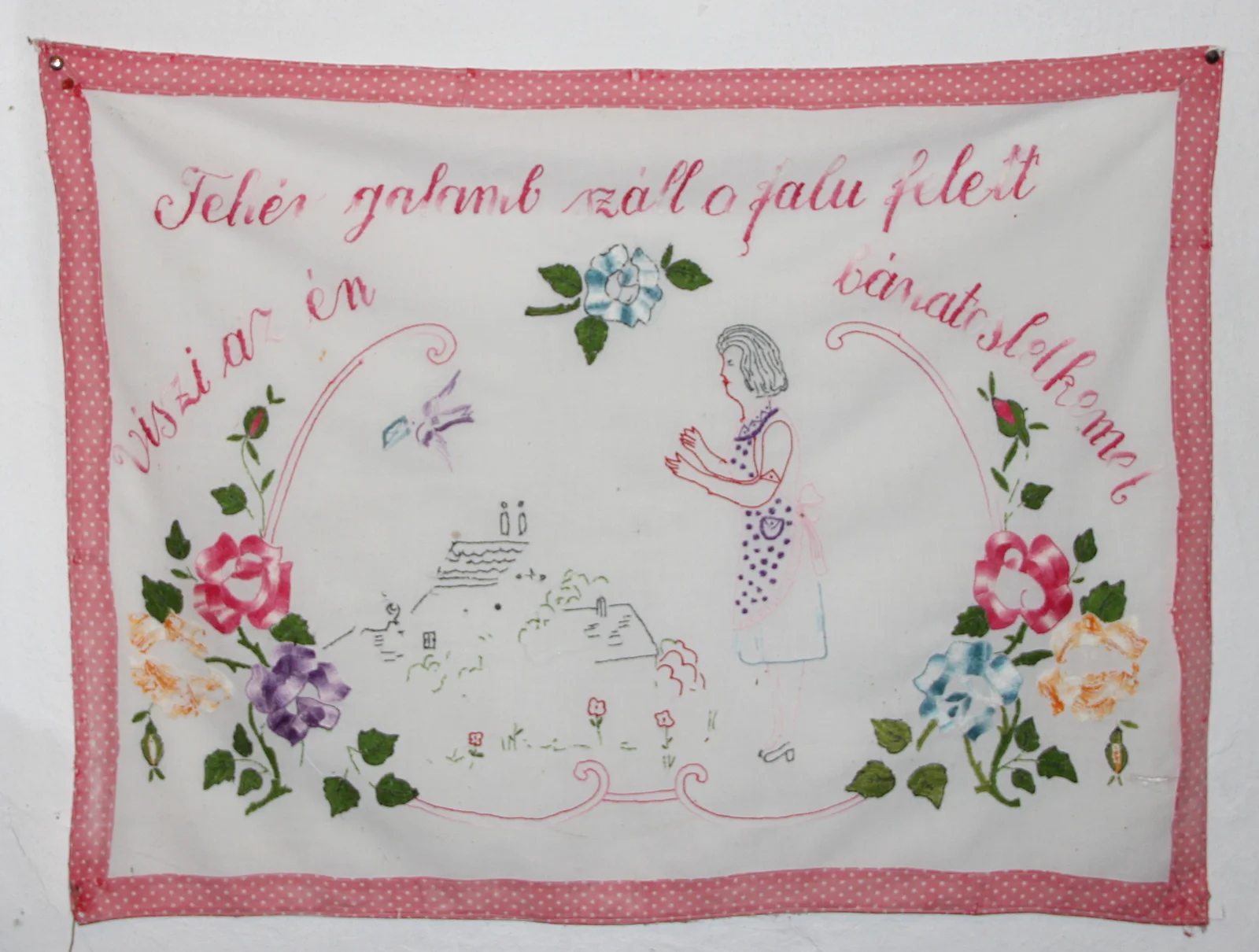 Description: With colorful embroidery. Text: "A white dove flew over the village, carrying my sorrowful soul." Motif: female figure, dove with a leaf, and houses, in a floral frame. Partially embroidered with shaded thread. Framed with red fabric with white polka dots.